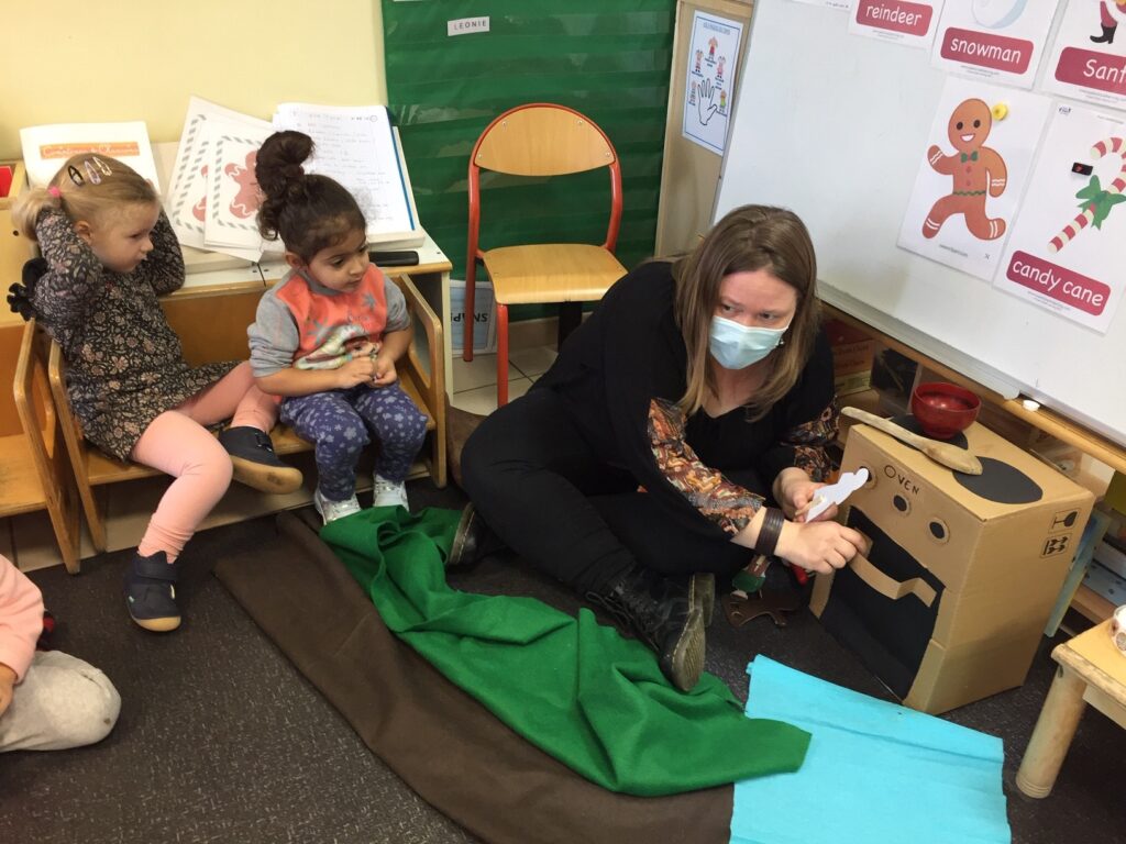 Ici Magda est en train de nous raconter l'histoire de Gingerbread man, c'est l'histoire du petit bonhomme de pain d'épice. Elle a mimé l'histoire avec une cuisinière en carton... dernier cri ! Nous avons répété le nom des animaux qui essaient de manger le pauvre Gingerbread man.