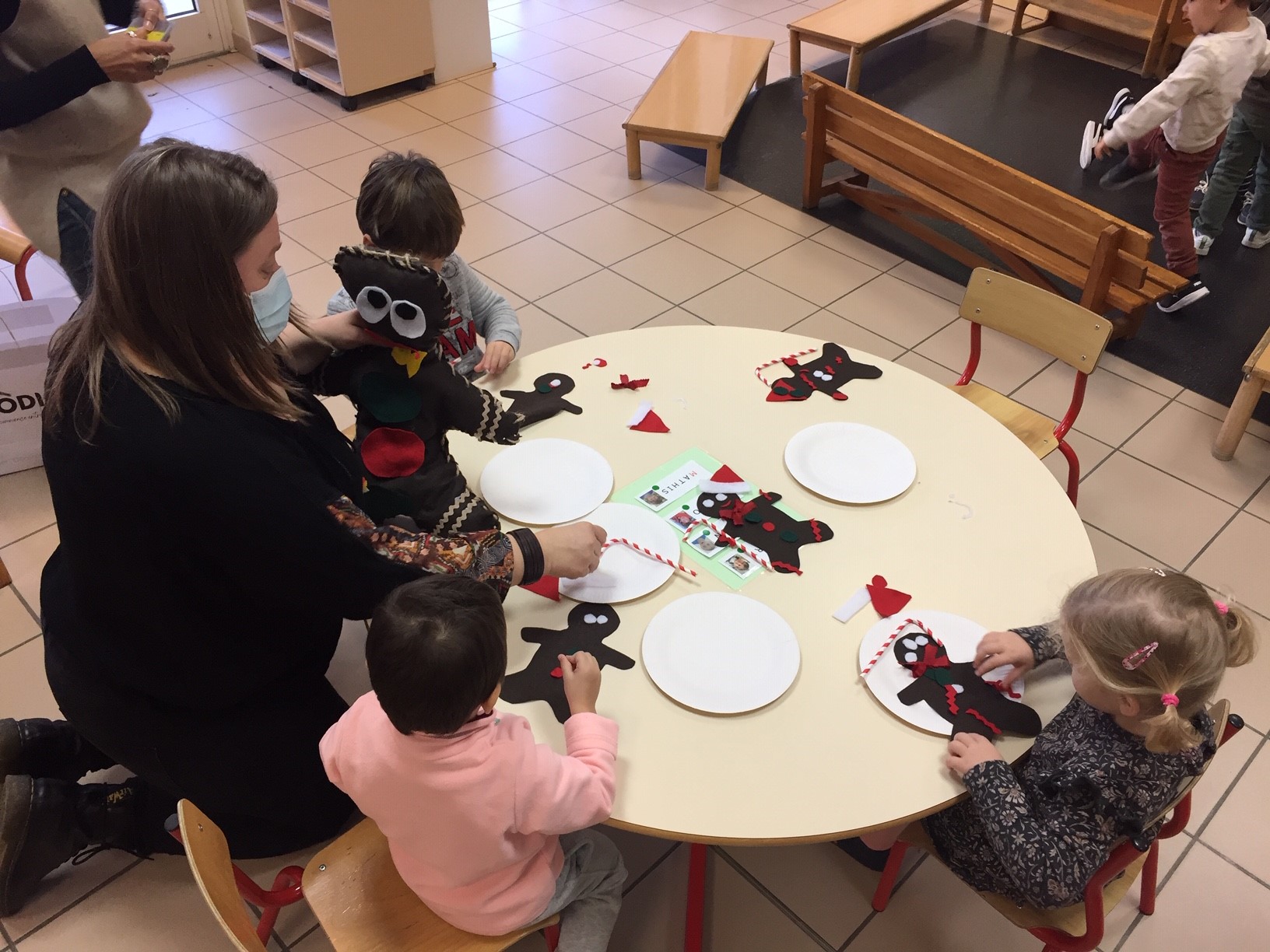 Et voilà justement Gingerbread man en feutrine qu'il fallu reconstituer. C'est l'occasion de répéter les mots appris aujourd'hui : red, green, candy cane, hat...