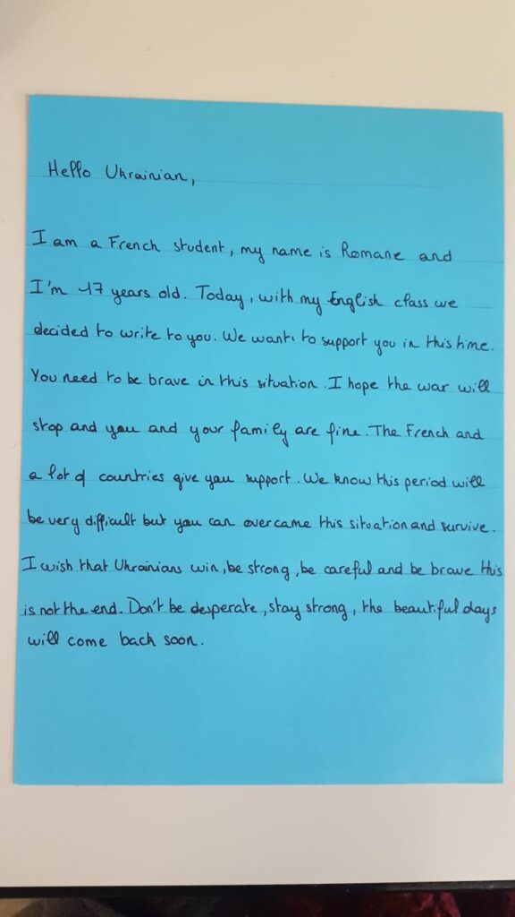 Les élèves de 2nde et de 1ère Spé Anglais ont écrit des lettres aux jeunes Ukrainiens pour leur communiquer leur soutien. Elles ont été collectées par les commerçants de Valréas et seront acheminées pour leur apporter un petit rayon de soleil et un message d'espoir !