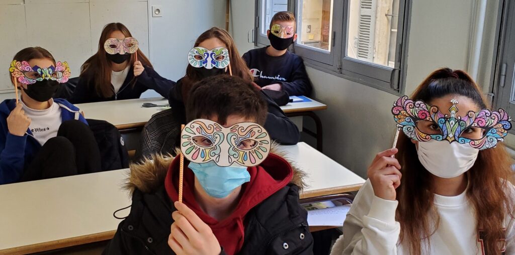 Les élèves de 3° qui suivent l'initiation italien ont confectionné de jolis masques en ce jour de Carnaval ! Nous avons également profité de cette séance pour visionner comment se passe l'ouverture du carnaval à Venise.