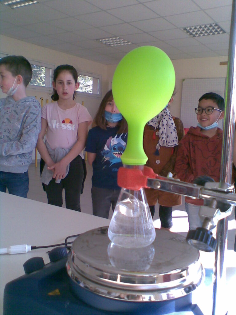 Et l'expérience a commencé : Nous avons mis de l'eau à chauffer dans le cristallisoir placé sur le bec électrique. Lorsque la température a atteint 100°C, de grosses bulles se sont formées. C'est l'ébullition. Quand les bulles ont éclaté, la vapeur d'eau est montée dans le ballon qui a gonflé. La vapeur d'eau est un gaz, c'est ce gaz qui a gonflé le ballon.