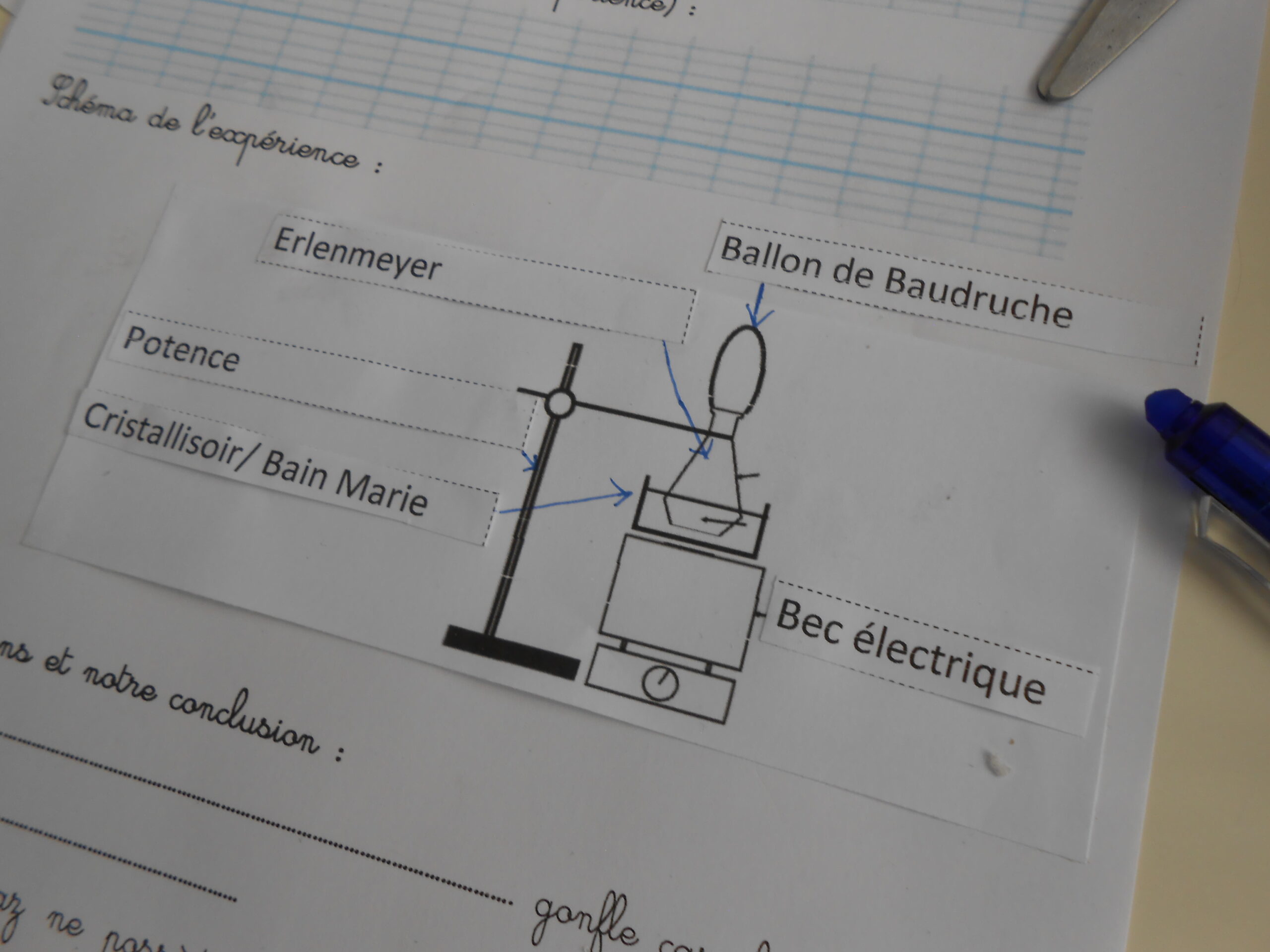 Nous avons ensuite appris le nom du matériel prévu pour l'expérience : potence, bec électrique, cristallisoir ou bain marie, Erlenmeyer et ballon de baudruche.
