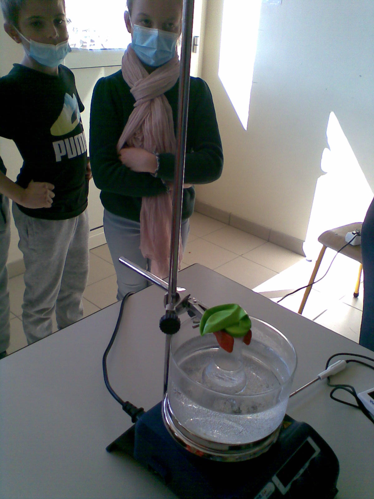 Et l'expérience a commencé : Nous avons mis de l'eau à chauffer dans le cristallisoir placé sur le bec électrique. Lorsque la température a atteint 100°C, de grosses bulles se sont formées. C'est l'ébullition. Quand les bulles ont éclaté, la vapeur d'eau est montée dans le ballon qui a gonflé. La vapeur d'eau est un gaz, c'est ce gaz qui a gonflé le ballon.