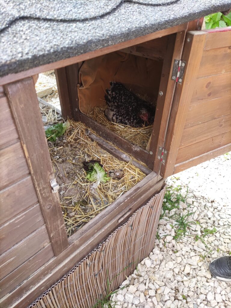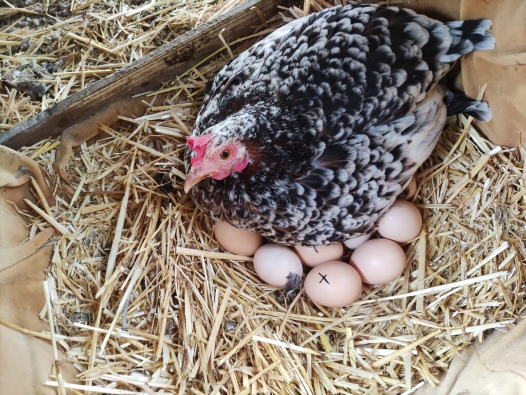 Aujourd'hui lundi 9 mai, nous venons de déposer une dizaine d'oeufs fécondés sous notre petite poulette tachetée qui a décidé de couver.