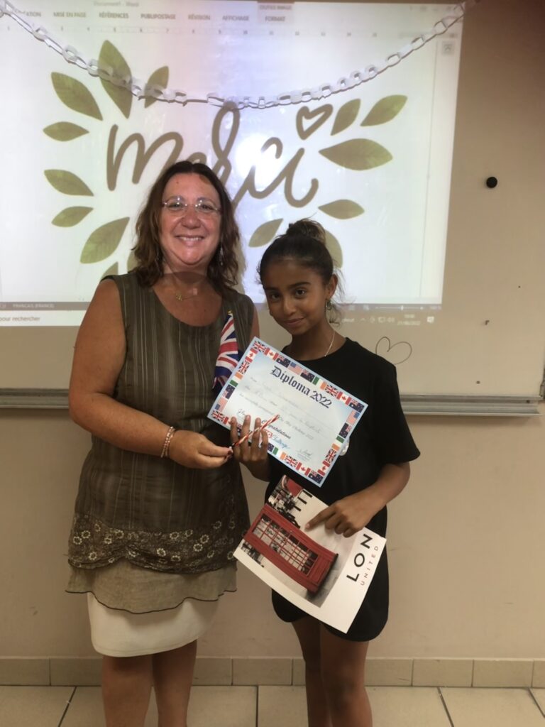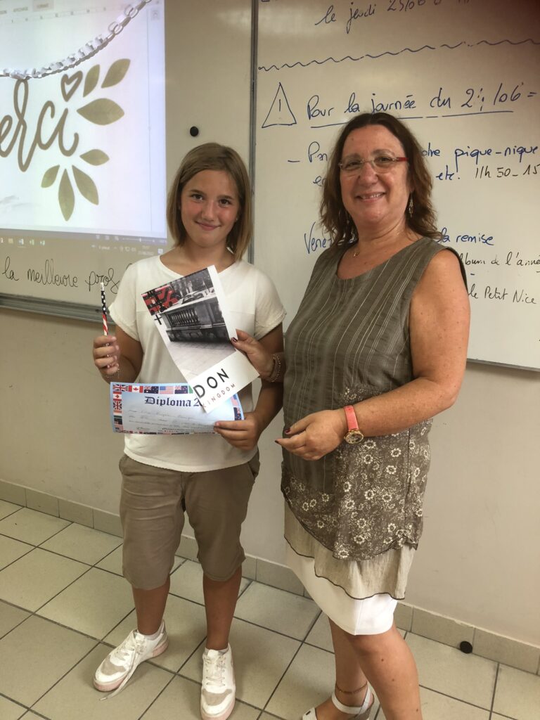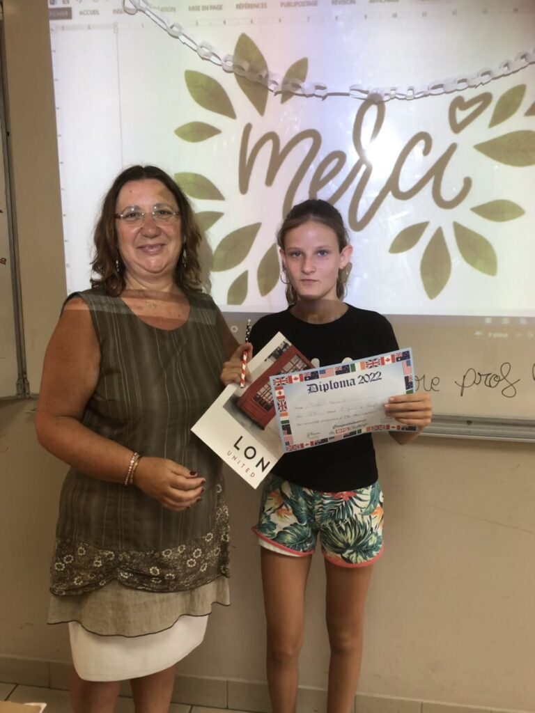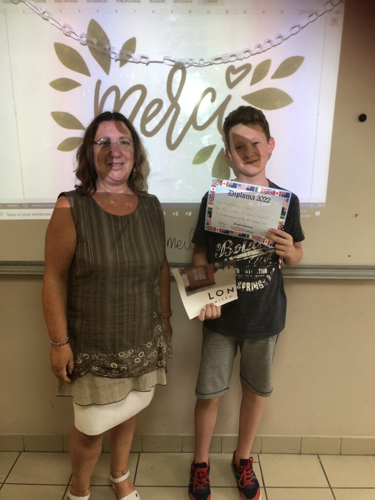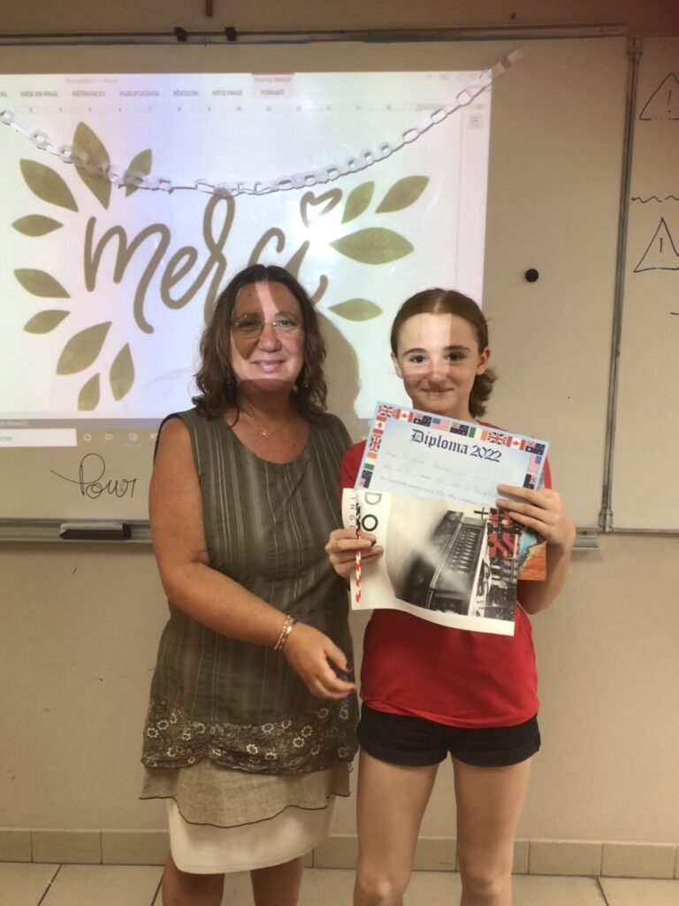 Chaque élève a reçu un diplôme à son nom, un poster et un crayon aux couleurs américaines. Les premiers de chaque classe ont reçu un diplôme doré et les premiers par niveau une médaille.