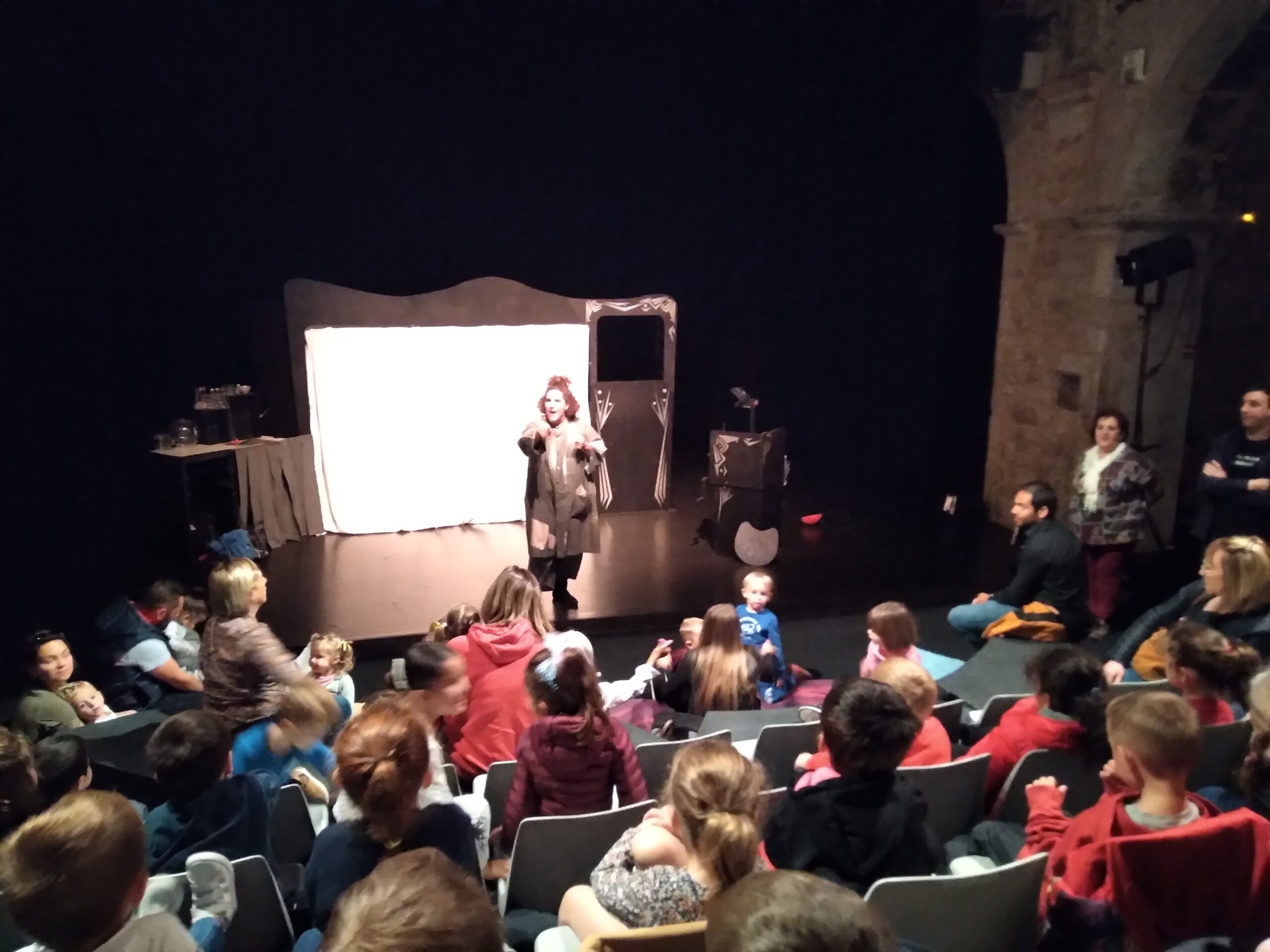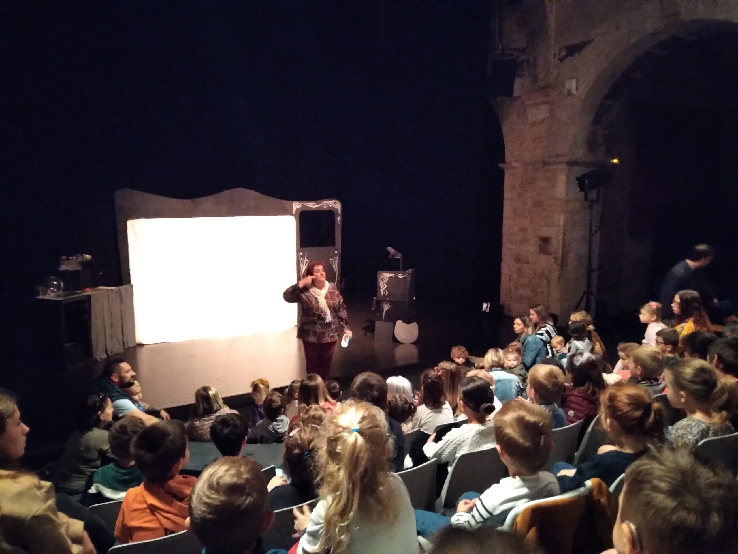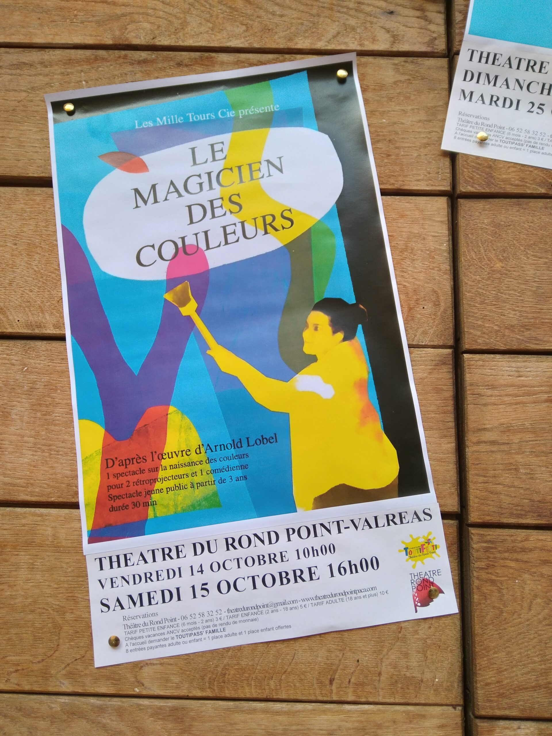 Ce vendredi 14 octobre, nos trois classes de cycle 1 (PS, MS et GS) sont allées au théâtre du Rond-Point (TRP) de Valréas pour voir "Le magicien des couleurs", un spectacle de la compagnie Mille Tours mis en scène par Guy Simon, d'après le conte de Arnold Lobel.