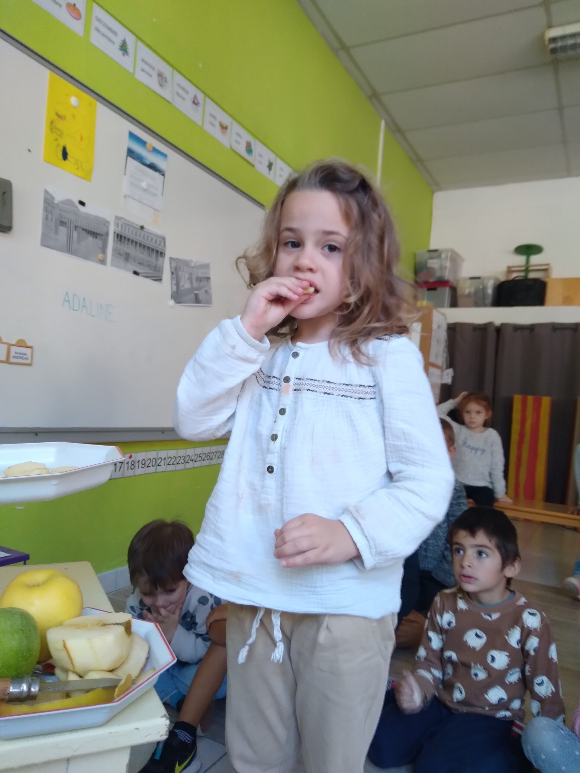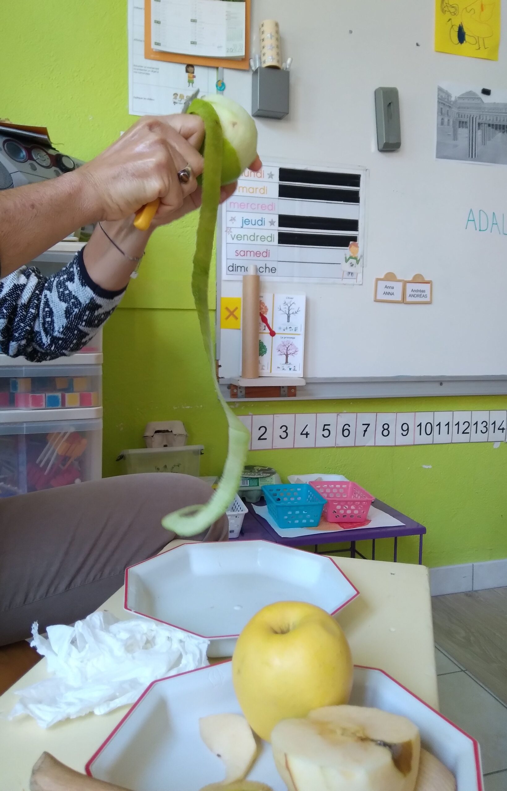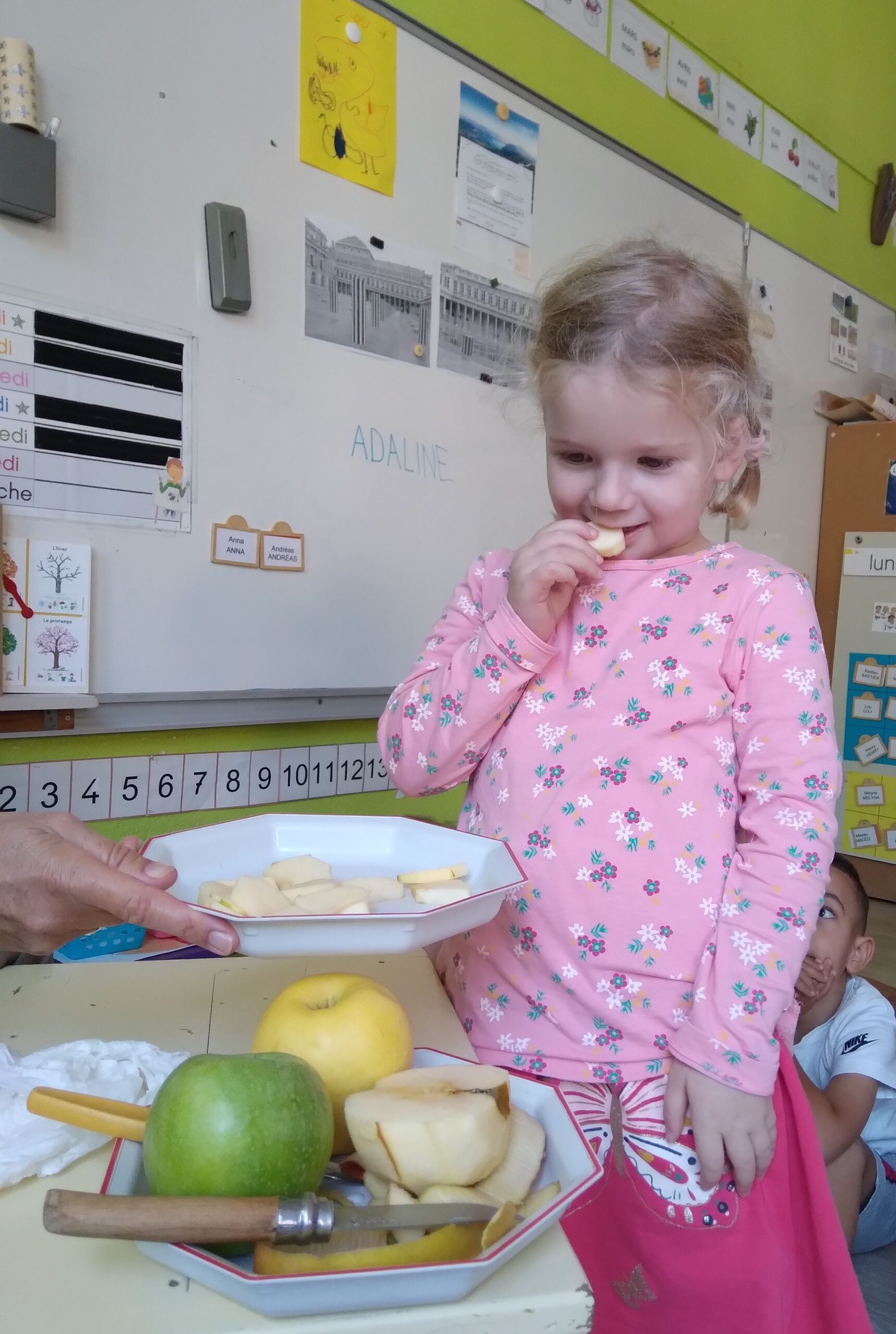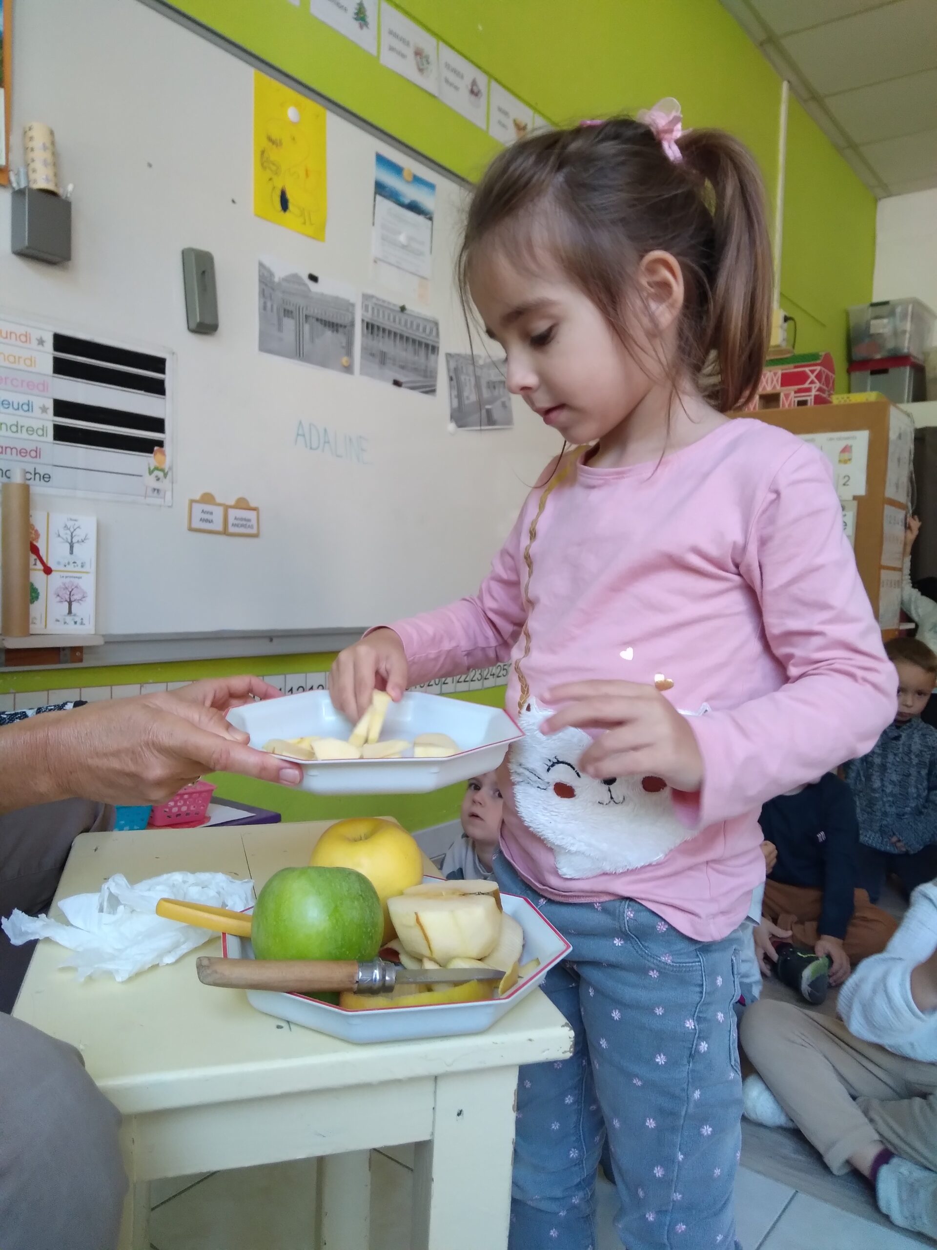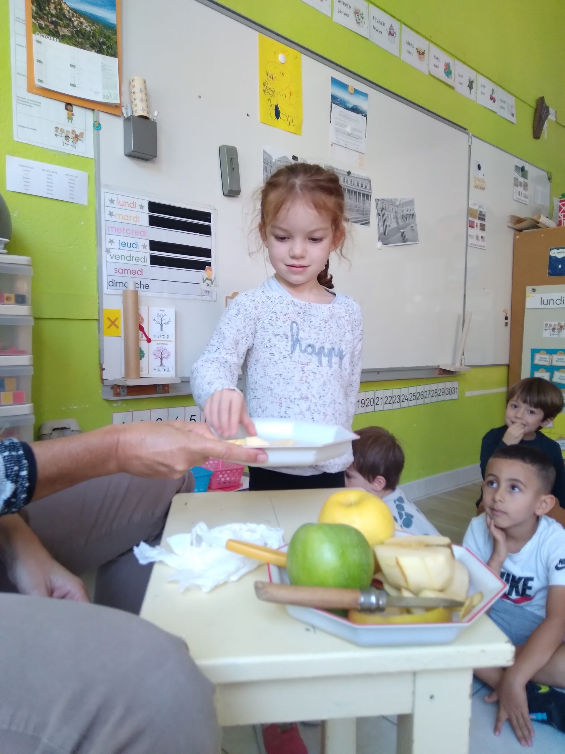 La maîtresse avait caché les pommes dans un sac en papier : il fallait toucher et sentir pour deviner ce qui était caché... Puis elle les a épluchées et les a coupées en quartiers : chaque élève venait à tour de rôle choisir avec ses yeux le morceau qu'il voulait prendre et l'attraper mais attention, il ne fallait toucher qu'un seul morceau !