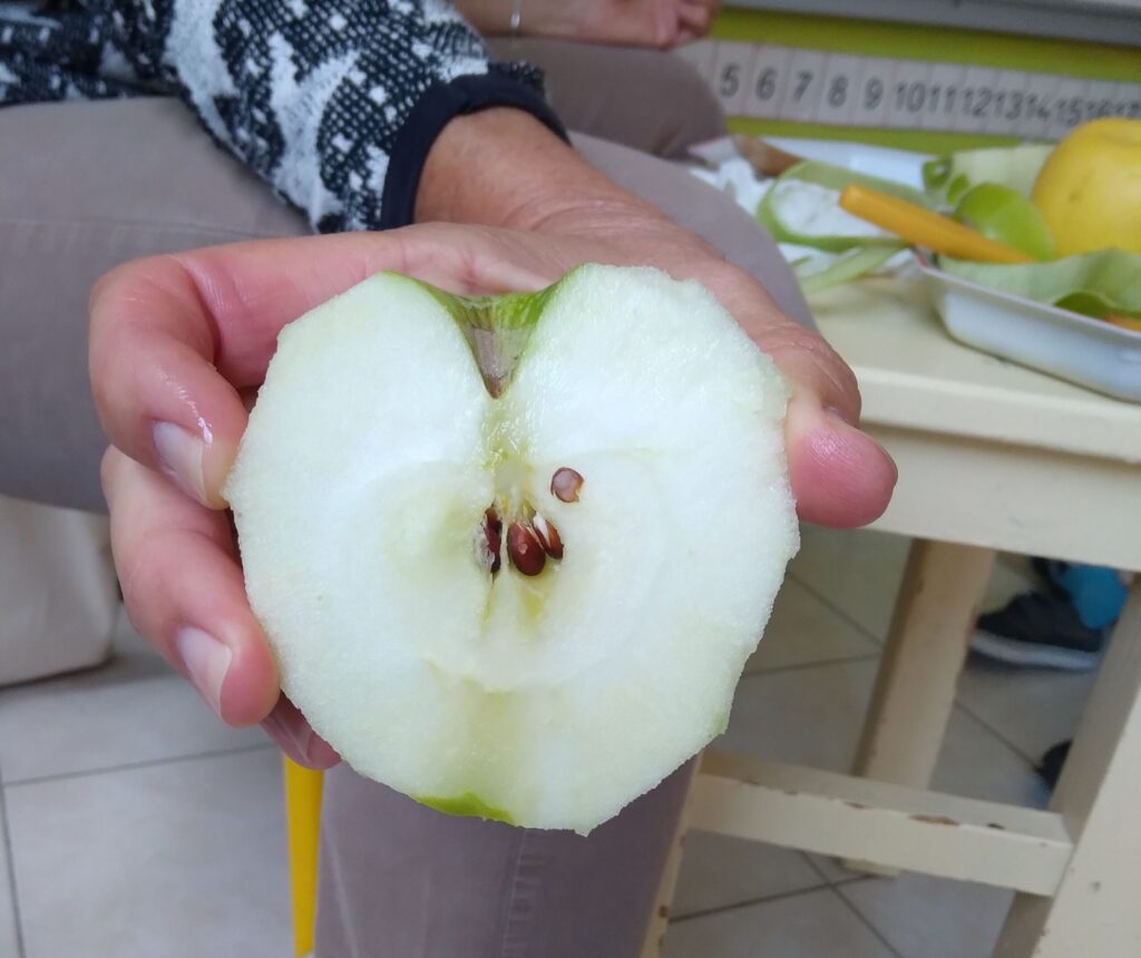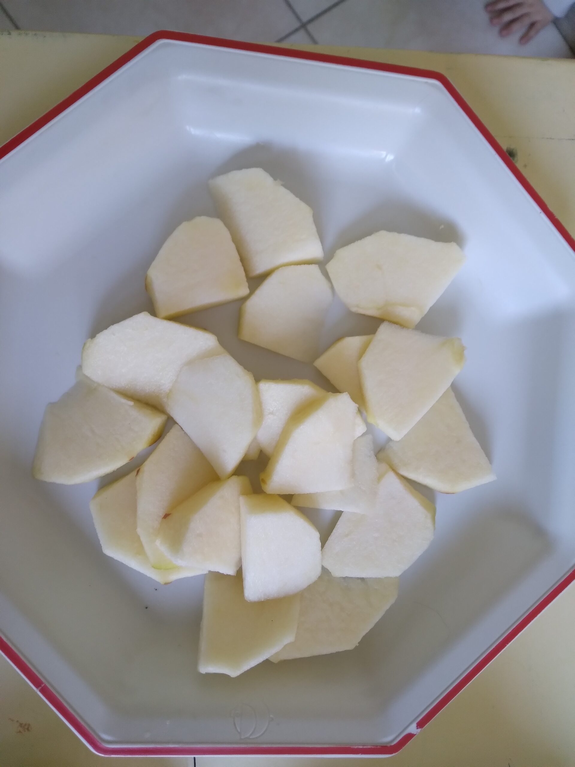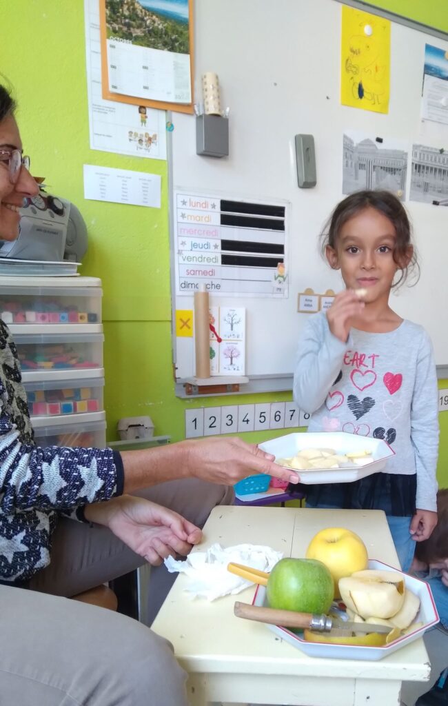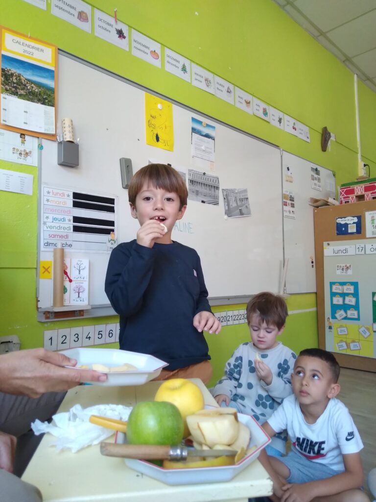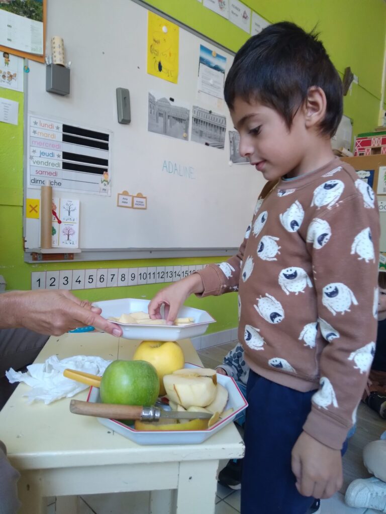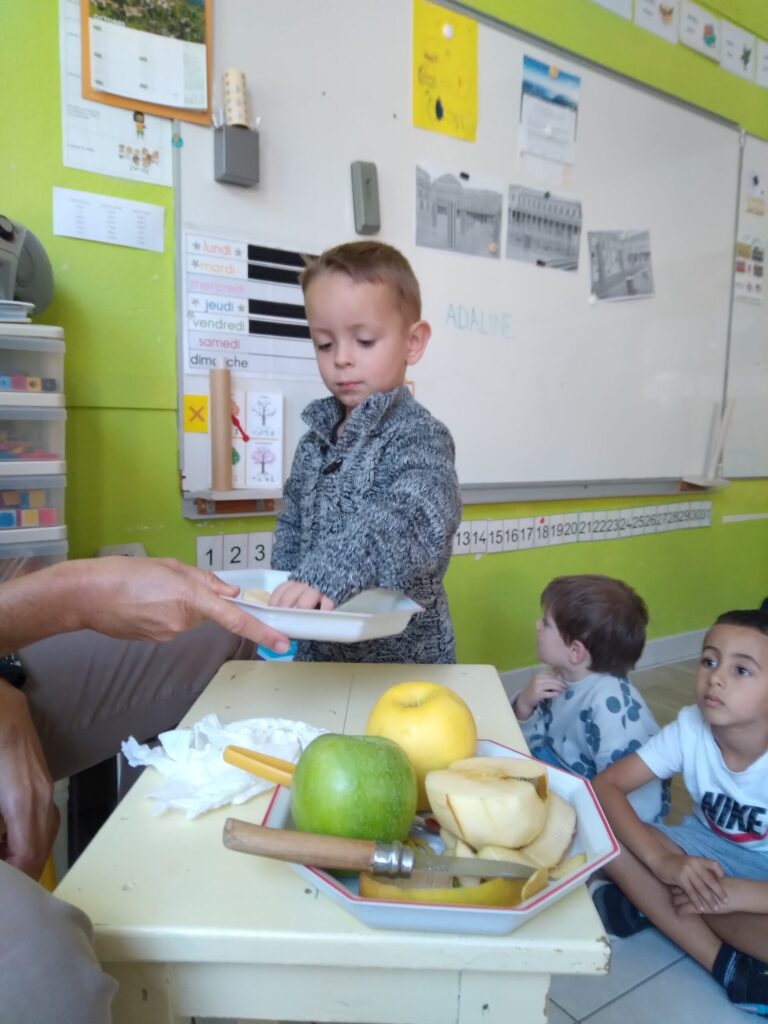 La maîtresse avait caché les pommes dans un sac en papier : il fallait toucher et sentir pour deviner ce qui était caché... Puis elle les a épluchées et les a coupées en quartiers : chaque élève venait à tour de rôle choisir avec ses yeux le morceau qu'il voulait prendre et l'attraper mais attention, il ne fallait toucher qu'un seul morceau !