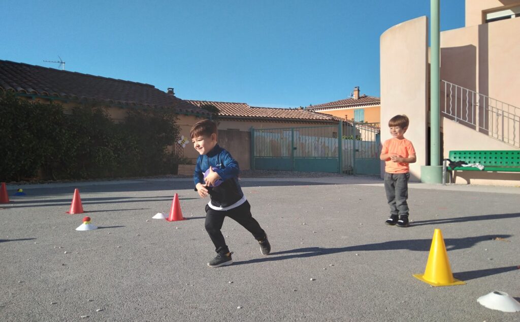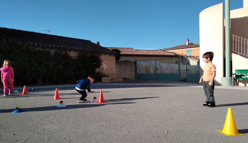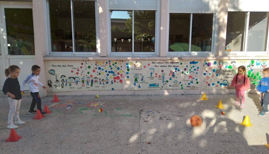 En fin de séance, toute la classe s'est retrouvée pour le grand jeu des balles brûlantes : c'est l'équipe qui a le moins de balles dans son camp qui a gagné !