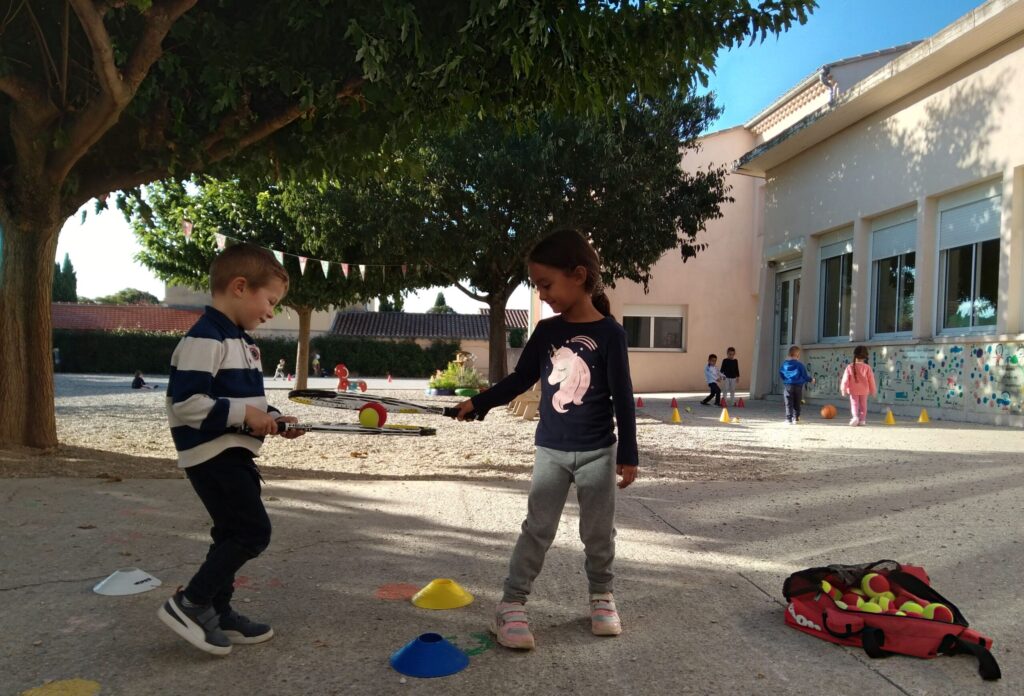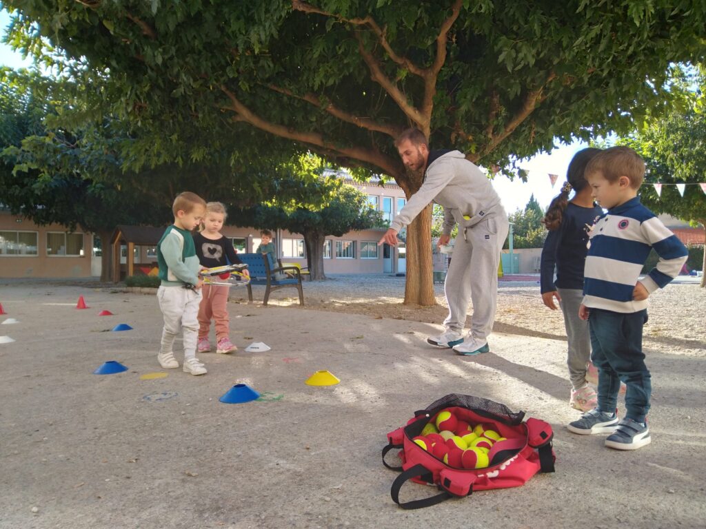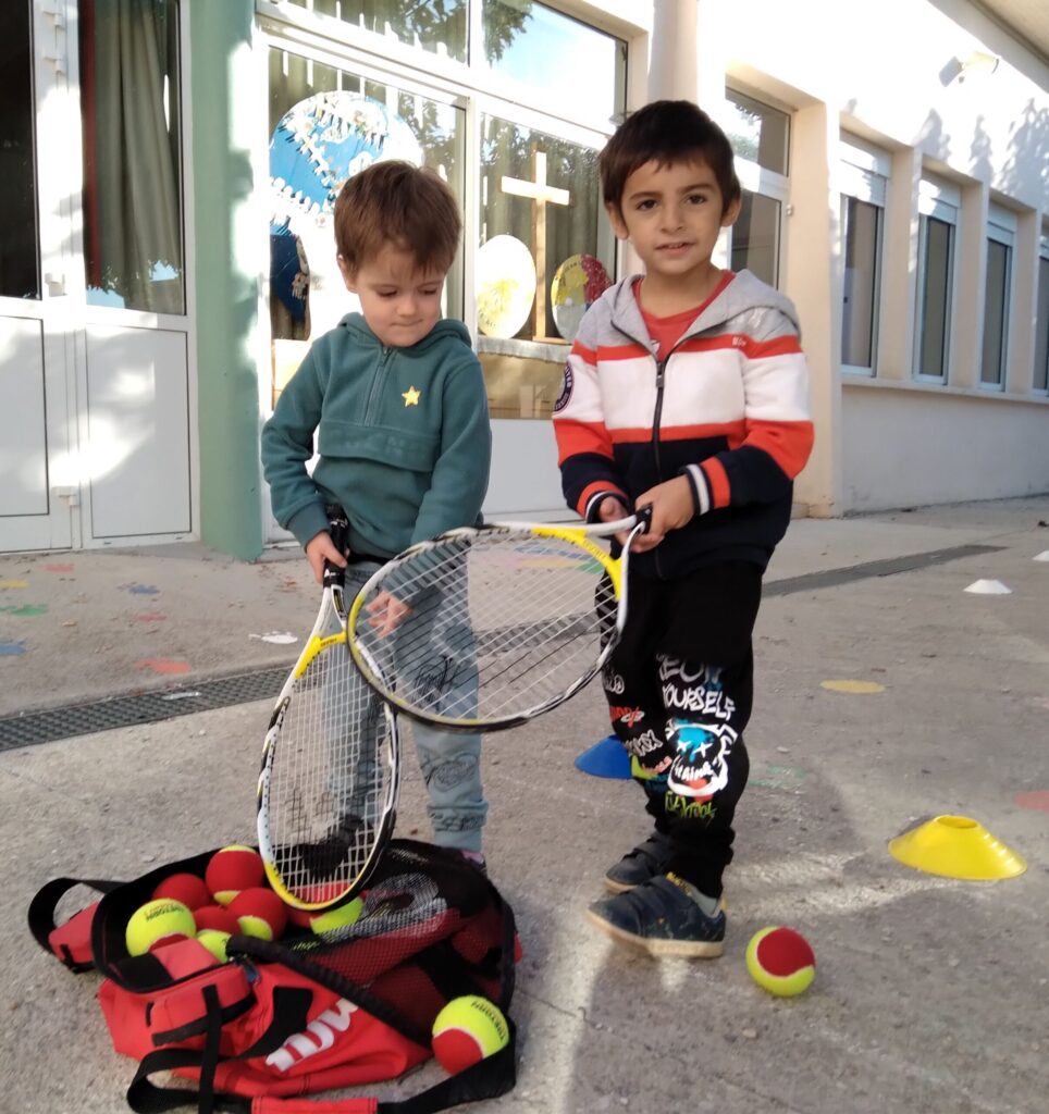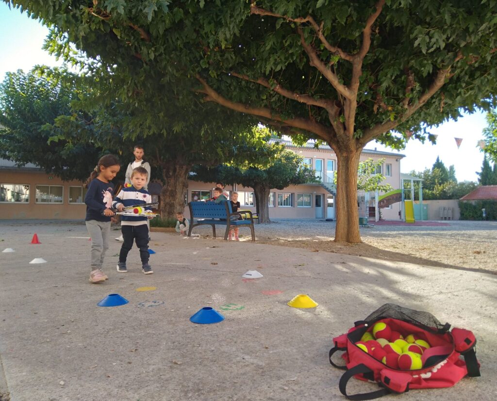 Mardi 11 octobre, Thibault et Thibault (deux animateurs du club de Valréas) nous ont proposé des jeux d'initiation au tennis pour apprendre à viser, à mieux tenir une raquette, à coopérer, à ranger le matériel... Pendant 45 mn, nos trois groupes (le groupe bleu / le groupe jaune / le groupe vert) ont tourné sur trois ateliers.