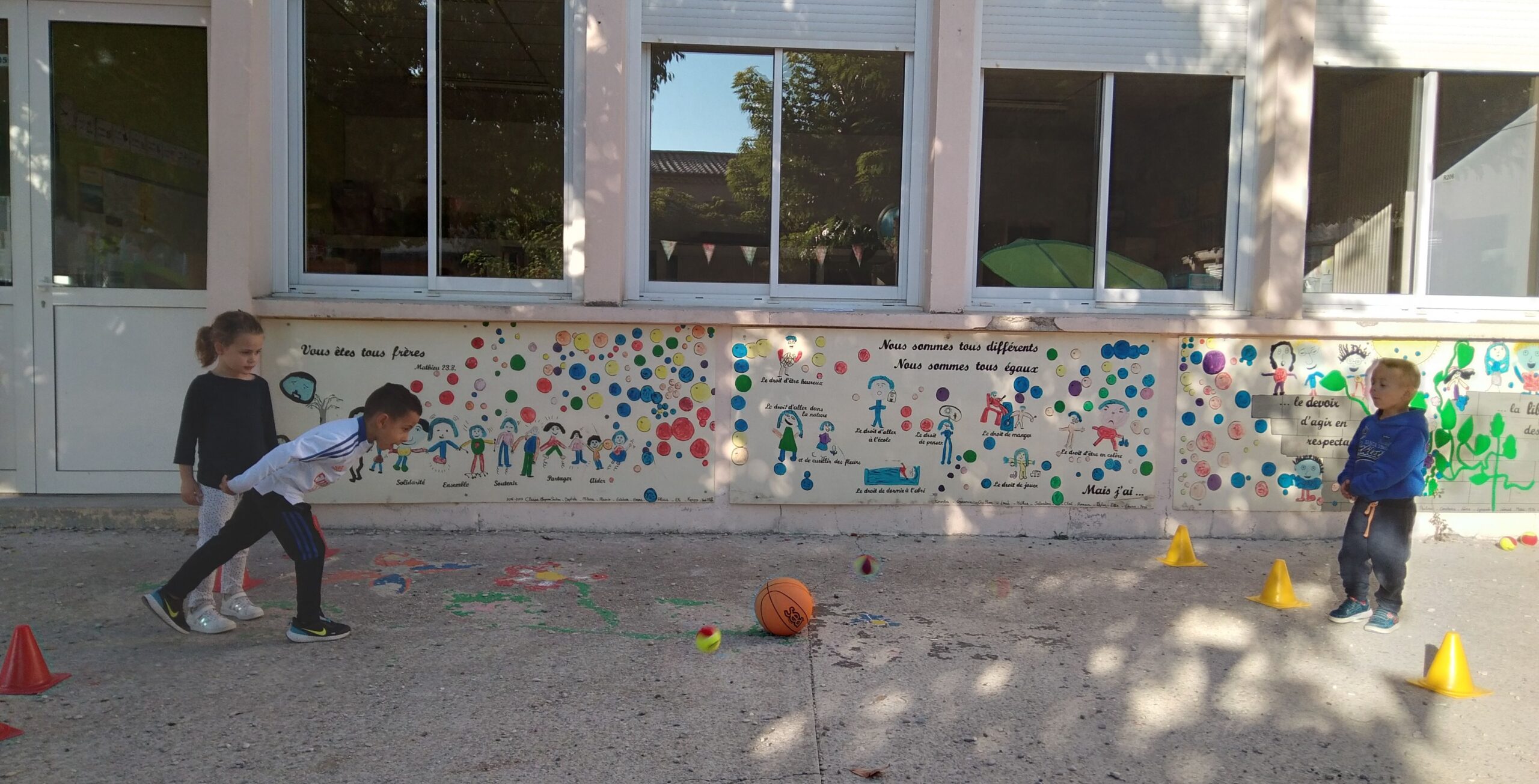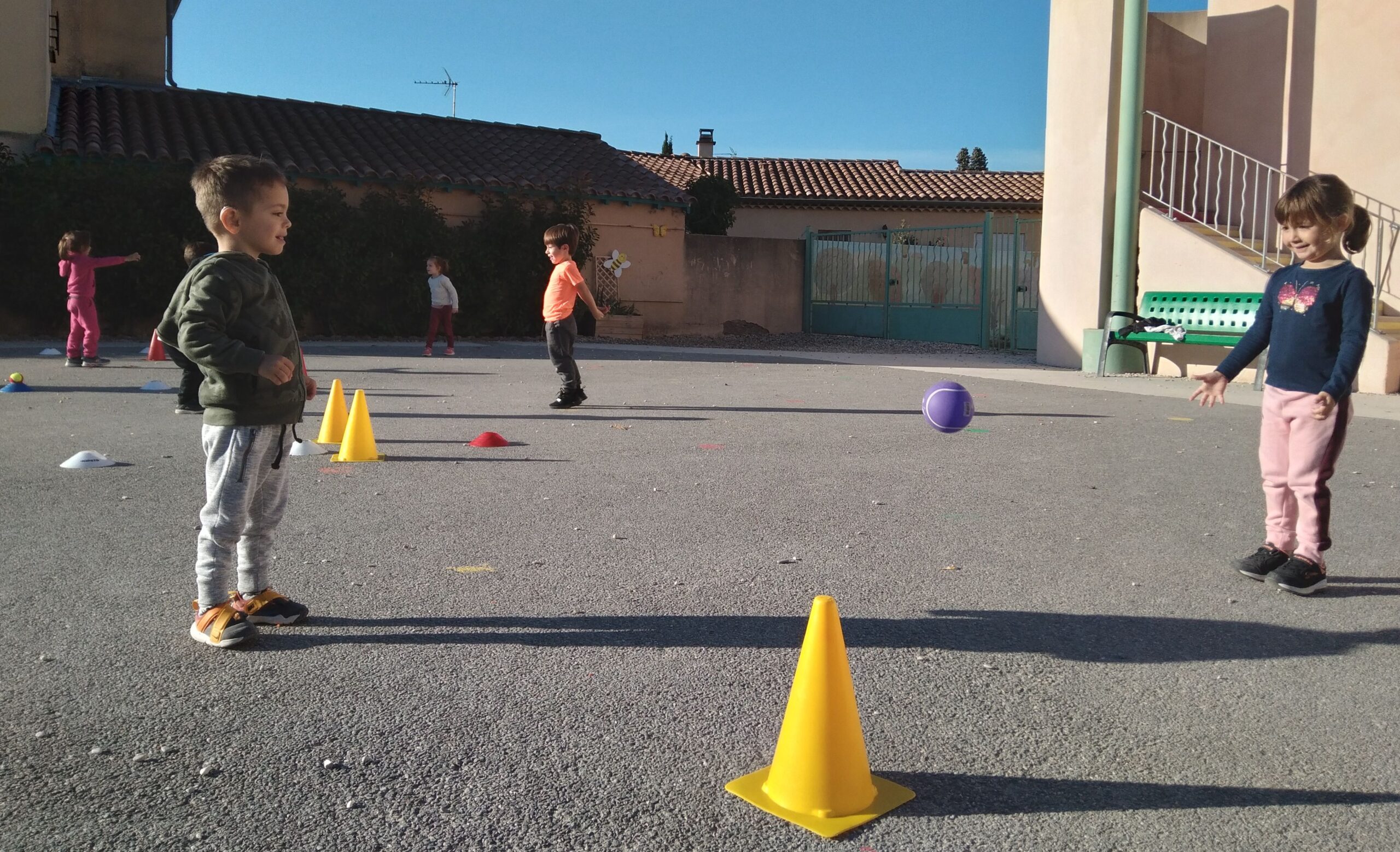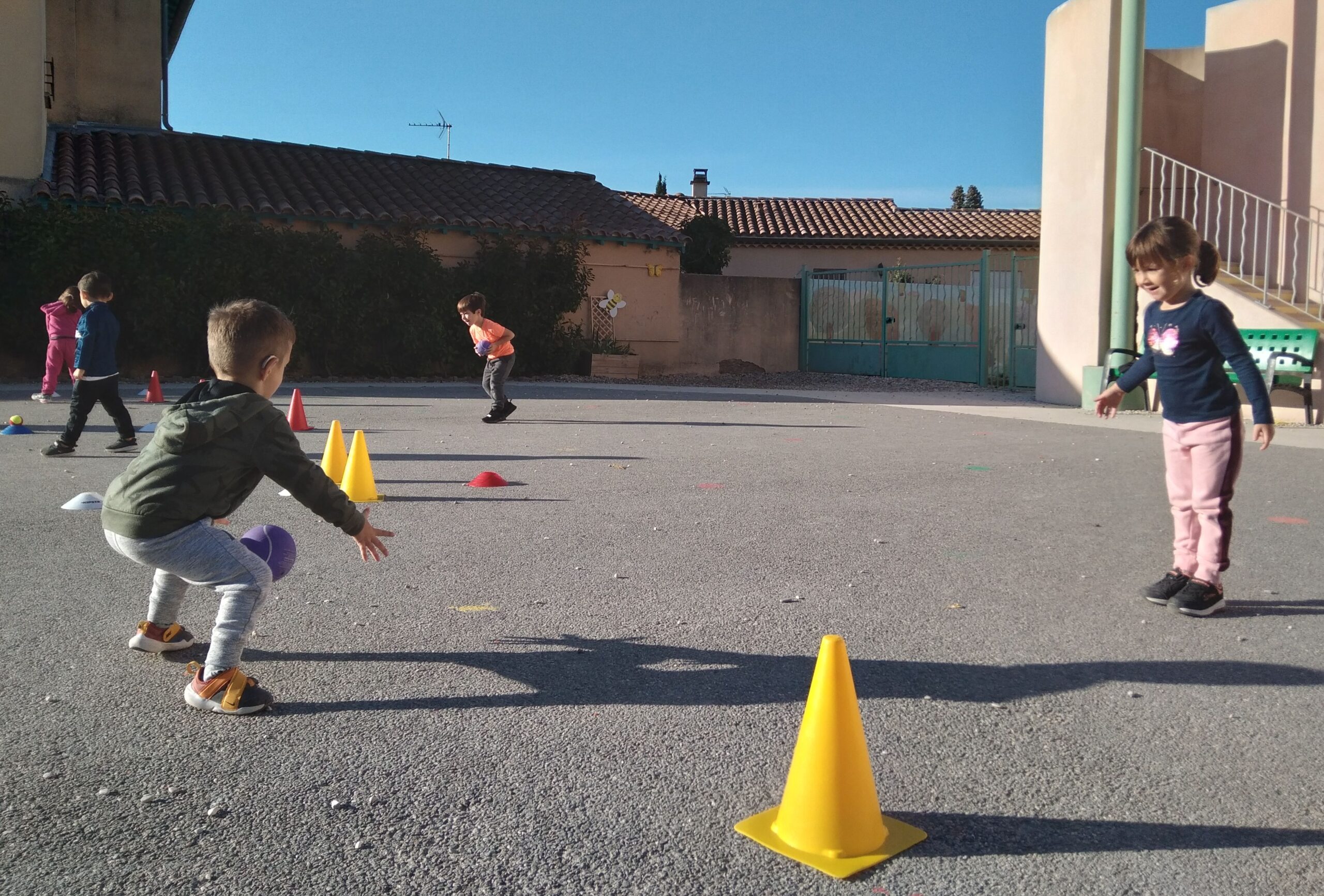 En fin de séance, toute la classe s'est retrouvée pour le grand jeu des balles brûlantes : c'est l'équipe qui a le moins de balles dans son camp qui a gagné !