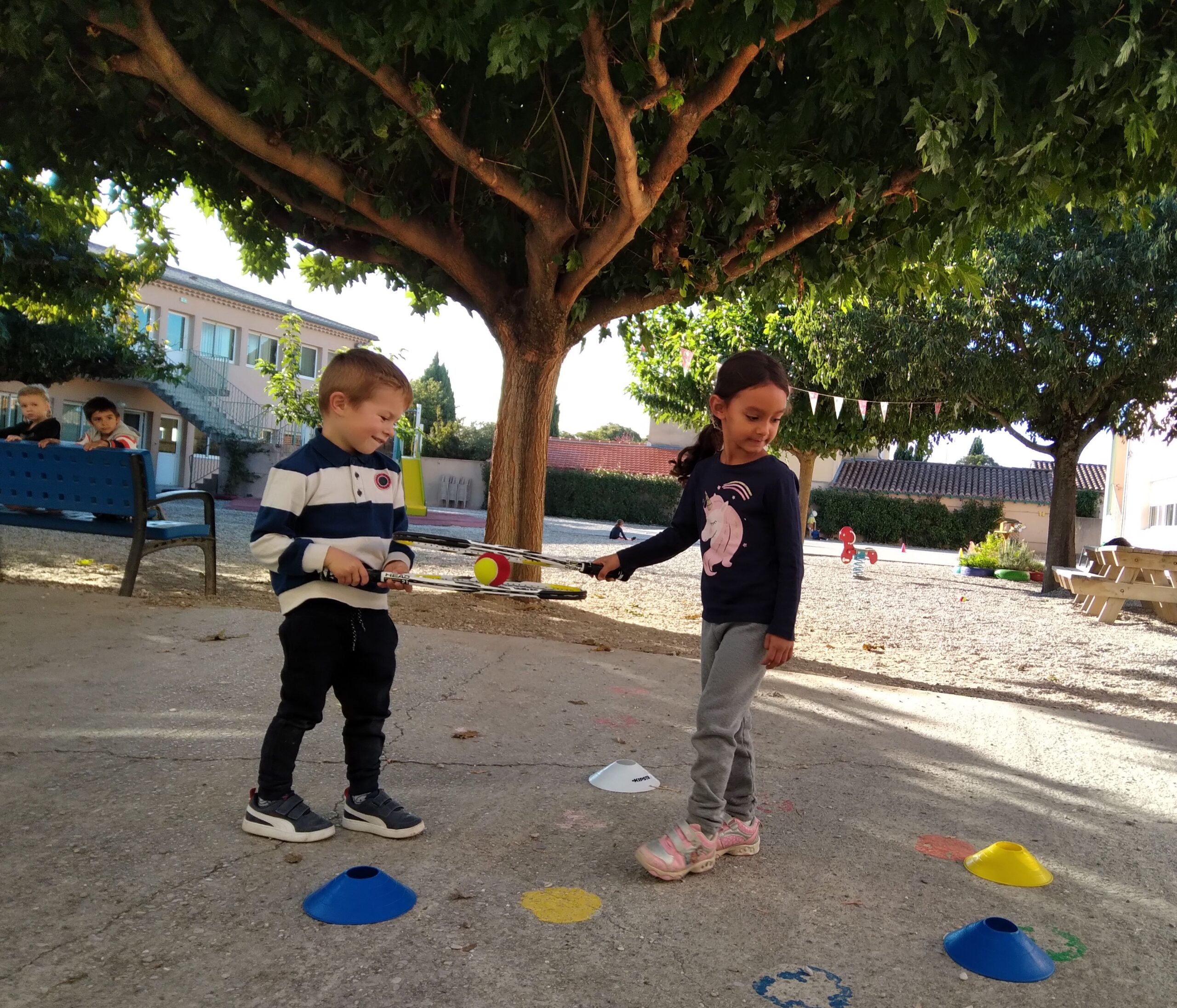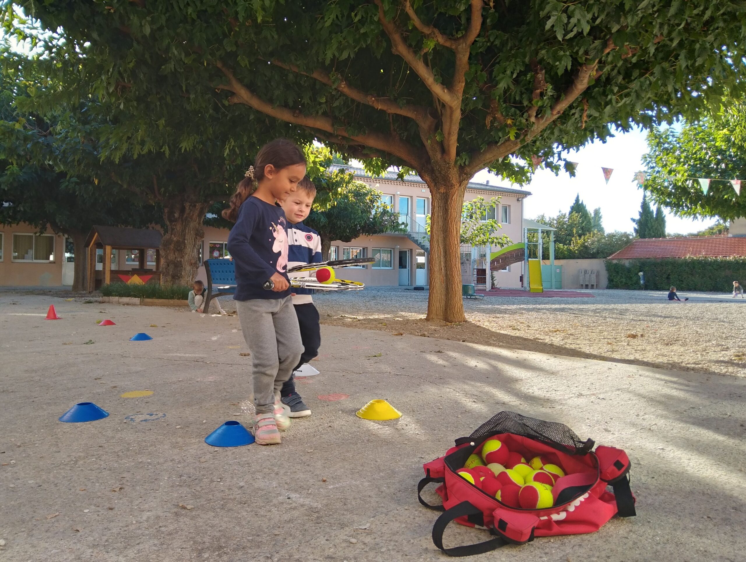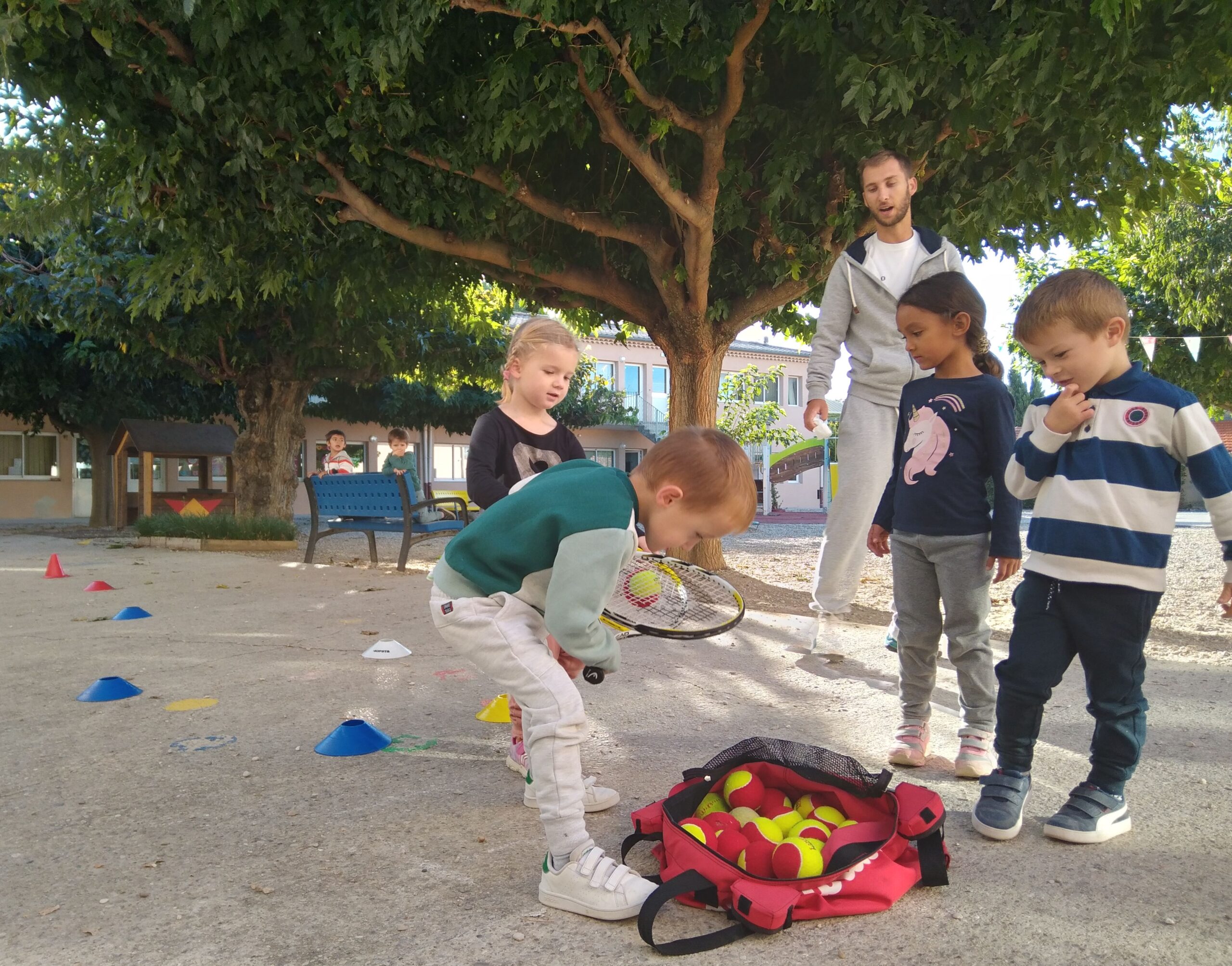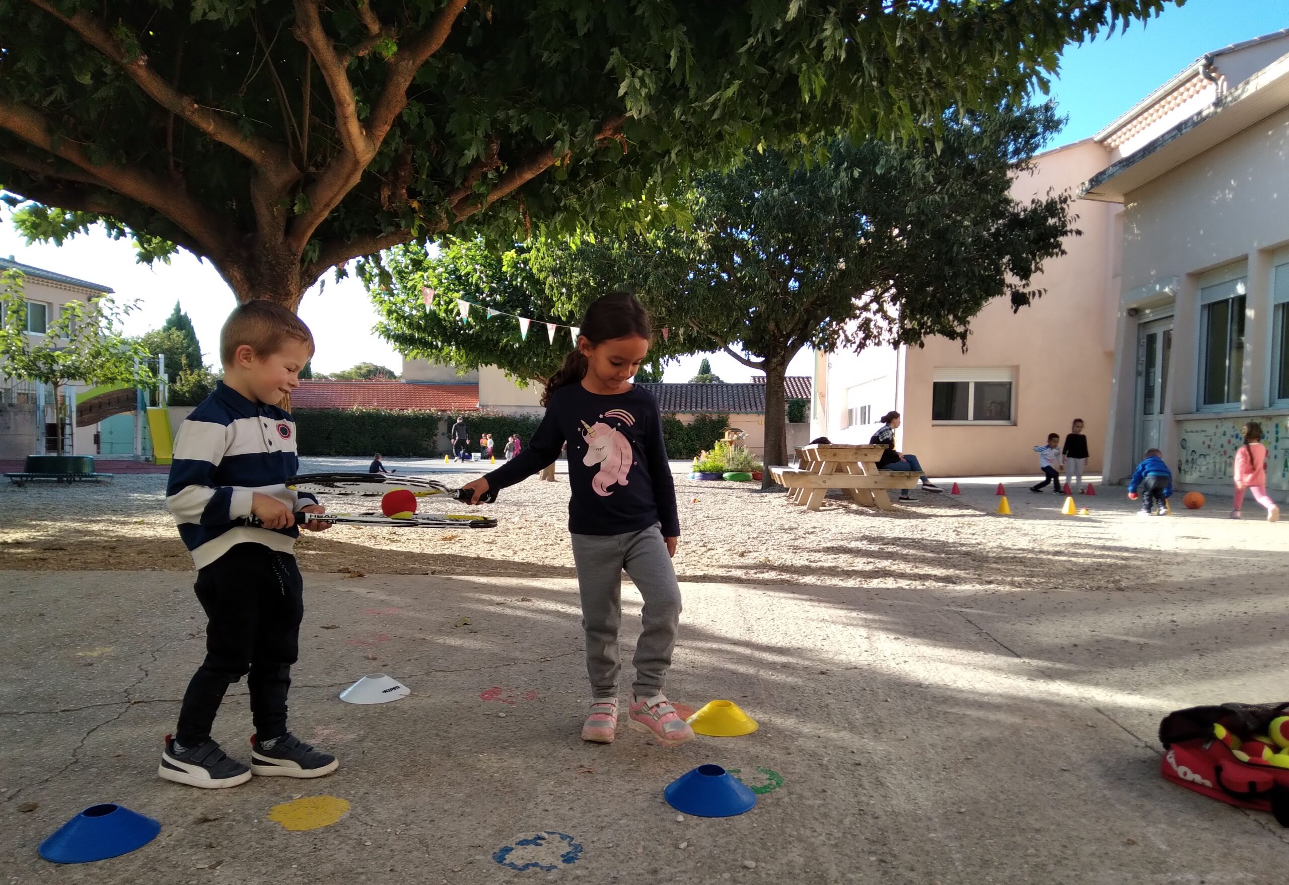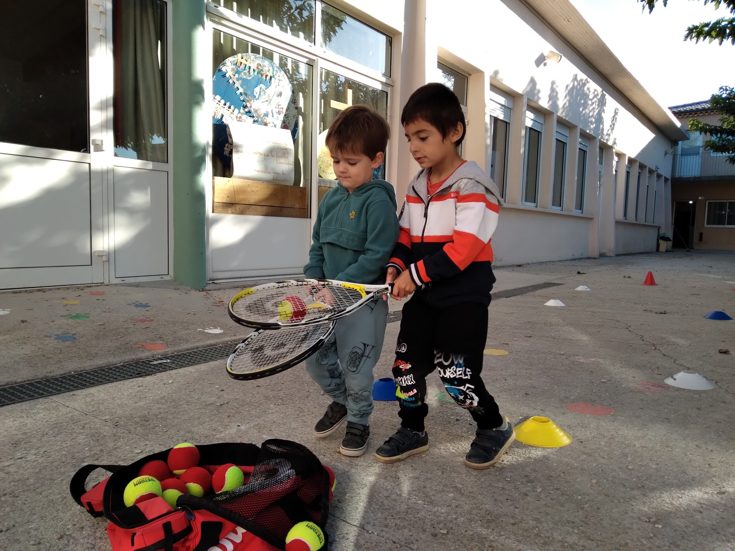Mardi 11 octobre, Thibault et Thibault (deux animateurs du club de Valréas) nous ont proposé des jeux d'initiation au tennis pour apprendre à viser, à mieux tenir une raquette, à coopérer, à ranger le matériel... Pendant 45 mn, nos trois groupes (le groupe bleu / le groupe jaune / le groupe vert) ont tourné sur trois ateliers.
