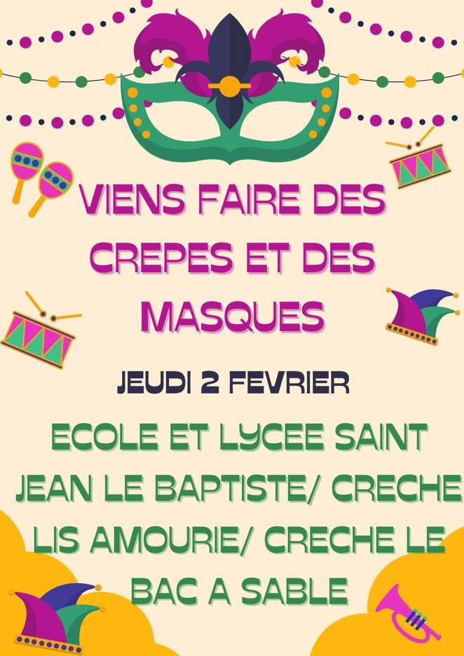 Aujourd'hui, jour de la chandeleur et des traditionnelles crêpes, les enfants de Toute Petite Section et de Petite Section de maternelle de l'école SAINT JEAN LE BAPTISTE ont invité leurs copains des crèches LIS AMORIE de Valréas et du BAC A SABLE de Visan à confectionner des crêpes et à fabriquer des masques. Cette matinée ludique et récréative était organisée en partenariat avec le lycée professionnel SAINT JEAN LE BAPTISTE. La classe de 3ème accompagnée par leurs enseignantes avait préparé des supports pour travailler la recette de la pâte à crêpe (jeux et affiches), plumes, gommettes étaient prêtes pour décorer les masques.