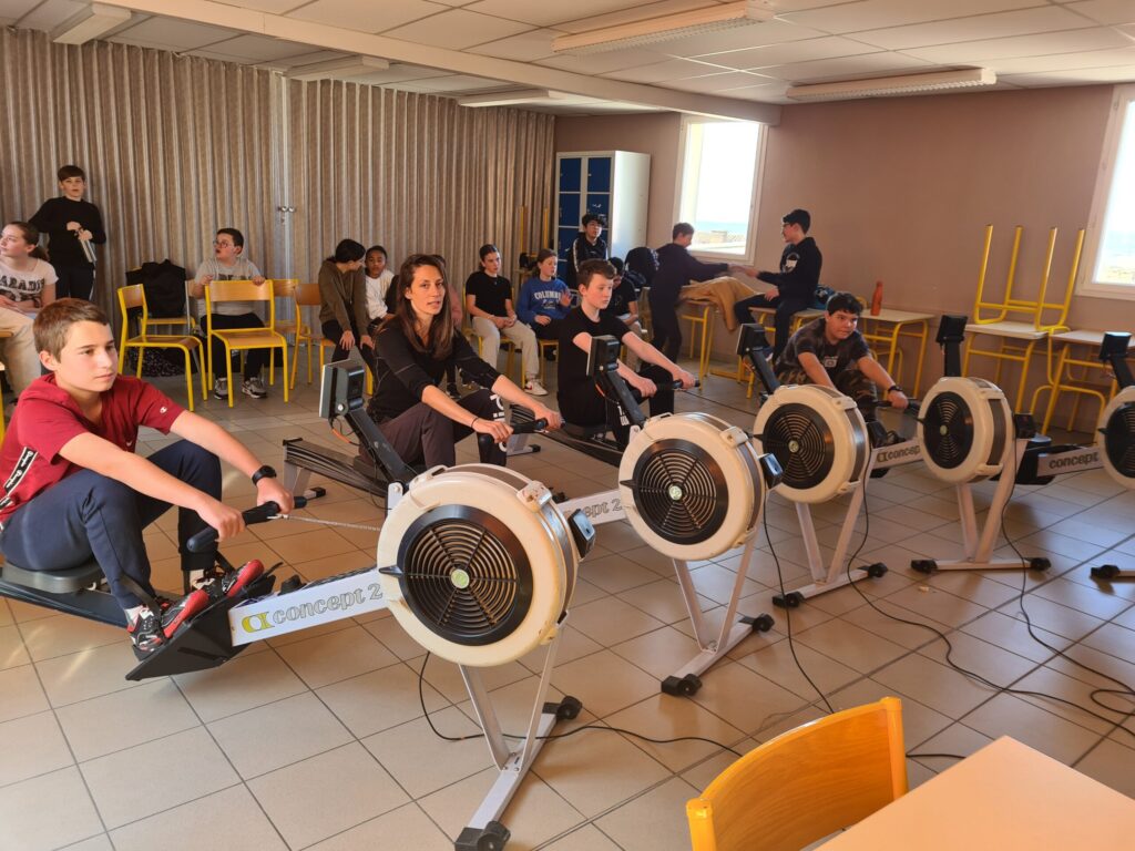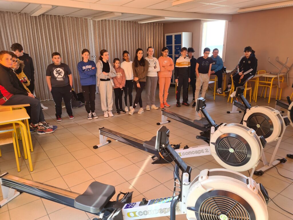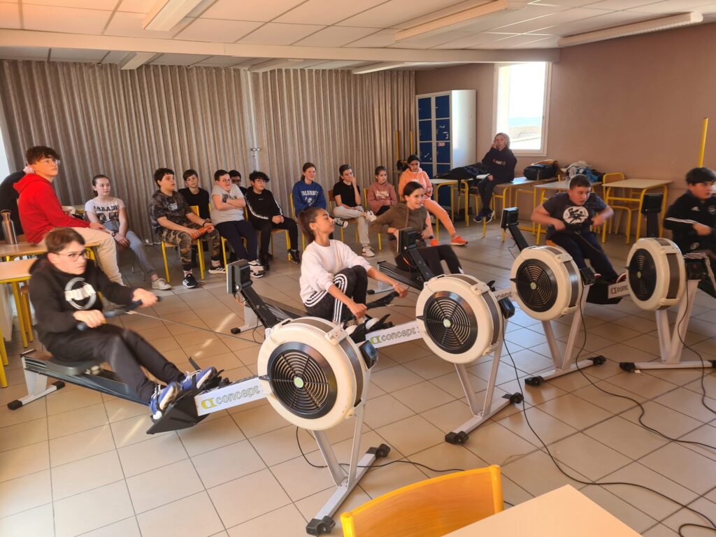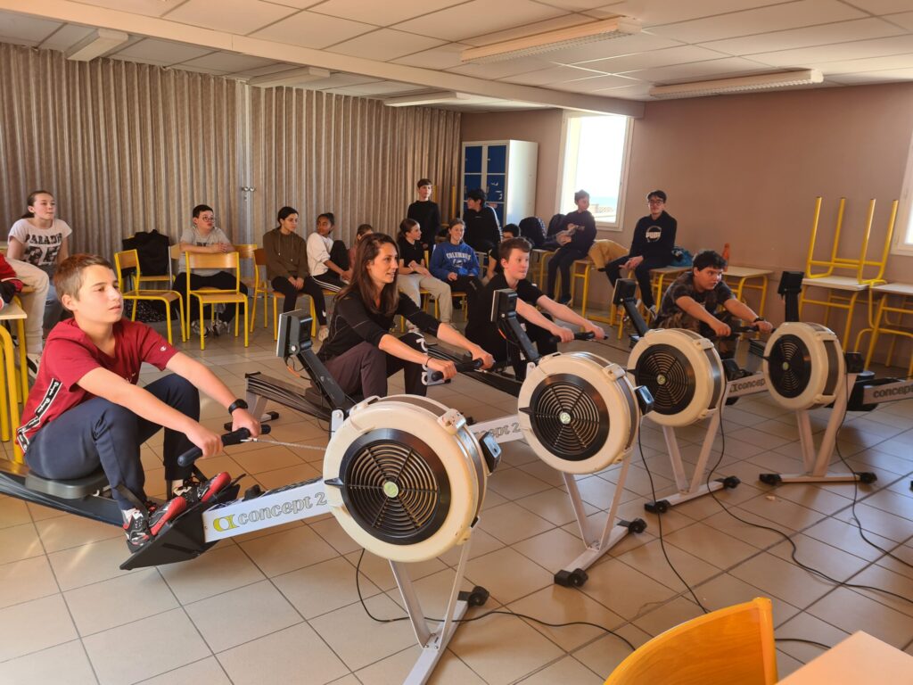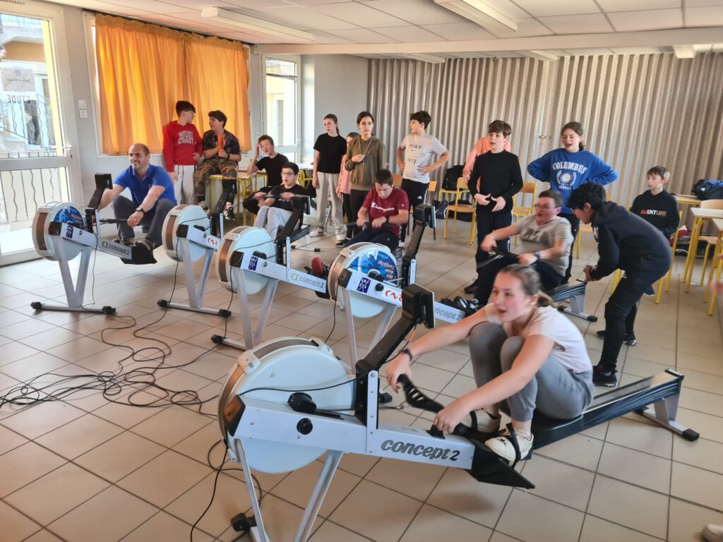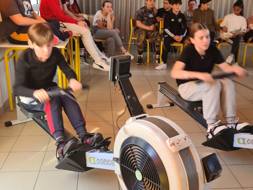 Jeudi 2 mars, les 5èmes B ont pu essayer un sport peu connu : l'aviron. Mais pas sur l'eau ! En classe ! " L'aviron indoor" est sport à par entière dans lequel on retrouve maintenant un véritable engouement avec des entrainements spécifiques et des compétitions. Pas d'équilibre à gérer, comme c'est le cas sur l'eau. Ni de coordination à trouver avec son ou ses partenaires. Seulement un effort d'endurance-force. C'est à dire qu'il s'agit d'efforts intenses mais que l'on tient plusieurs minutes. Cela se pratique sur machine (des rameurs!). Elles sont reliées à un ordinateur et un logiciel qui permet de voir la distance parcourue, la vitesse, la fréquence de rame, la cadence et sa place par rapport aux autres rameurs... Ils ont d'abord tenté de battre leur propre record sur 1min. (moyenne : 200m par élève). Nous avons additionné tous les résultats des élèves afin de se comparer aux autres classes de 5èmes de France... (résultats à venir sur le site "rameen5ème") Puis nous avons fait des relais de 4 personnes sur 1000m avec changement de rameur tous les 250m. Les élèves ont apprécié et certains ont trouvé l'effort particulièrement intense !!!!! Bravo à eux pour leur performance et leur bel état d'esprit !
