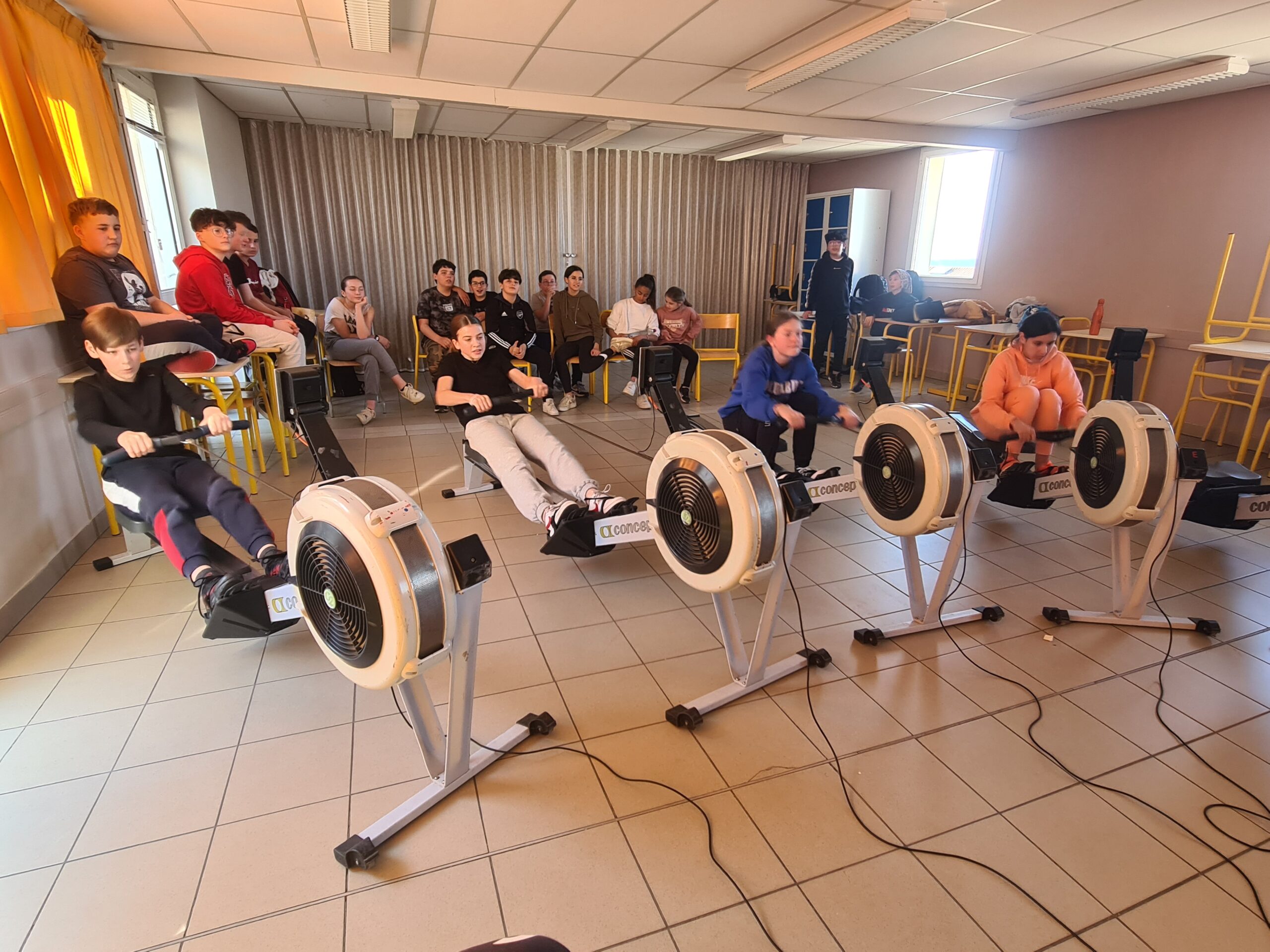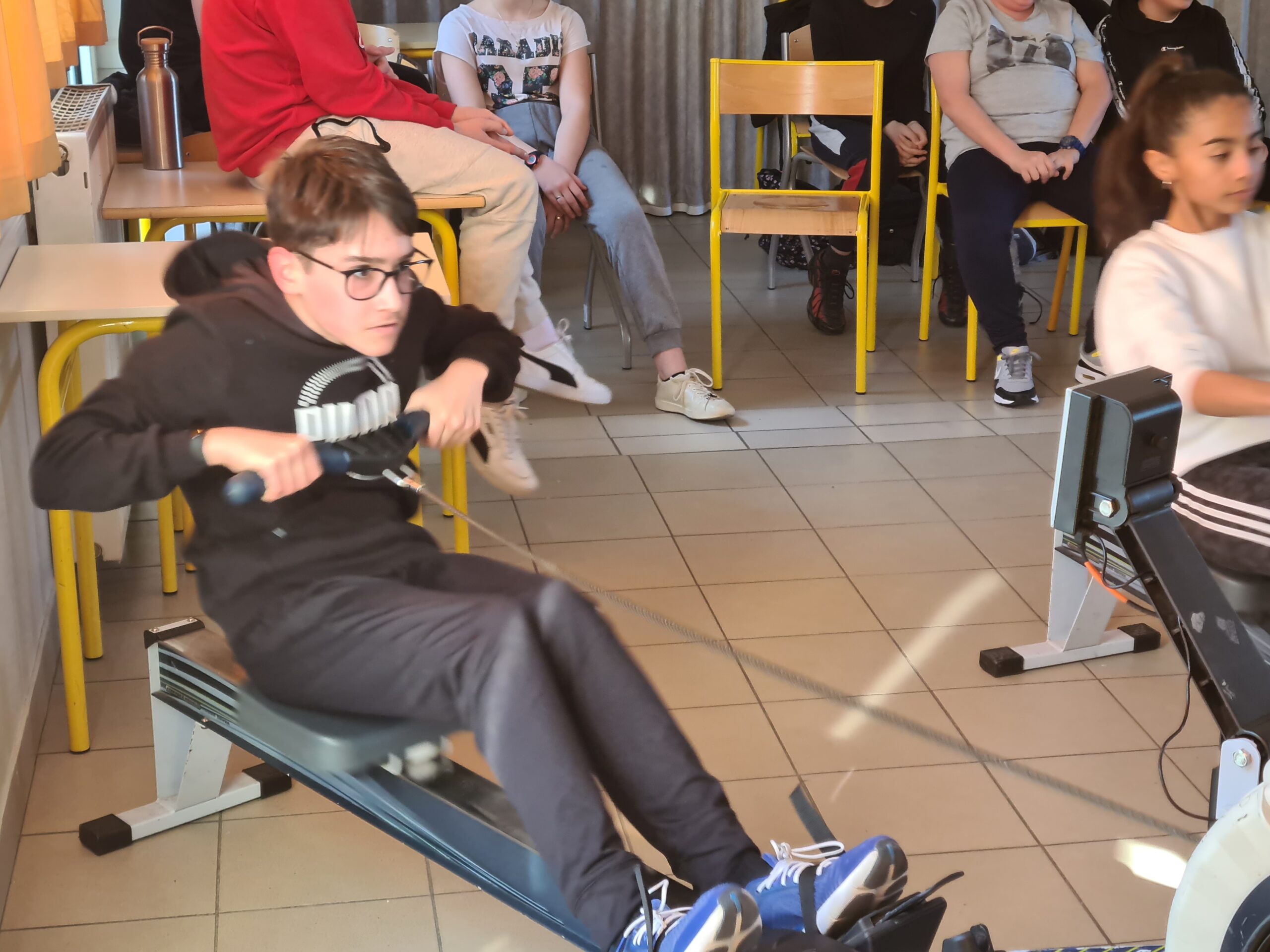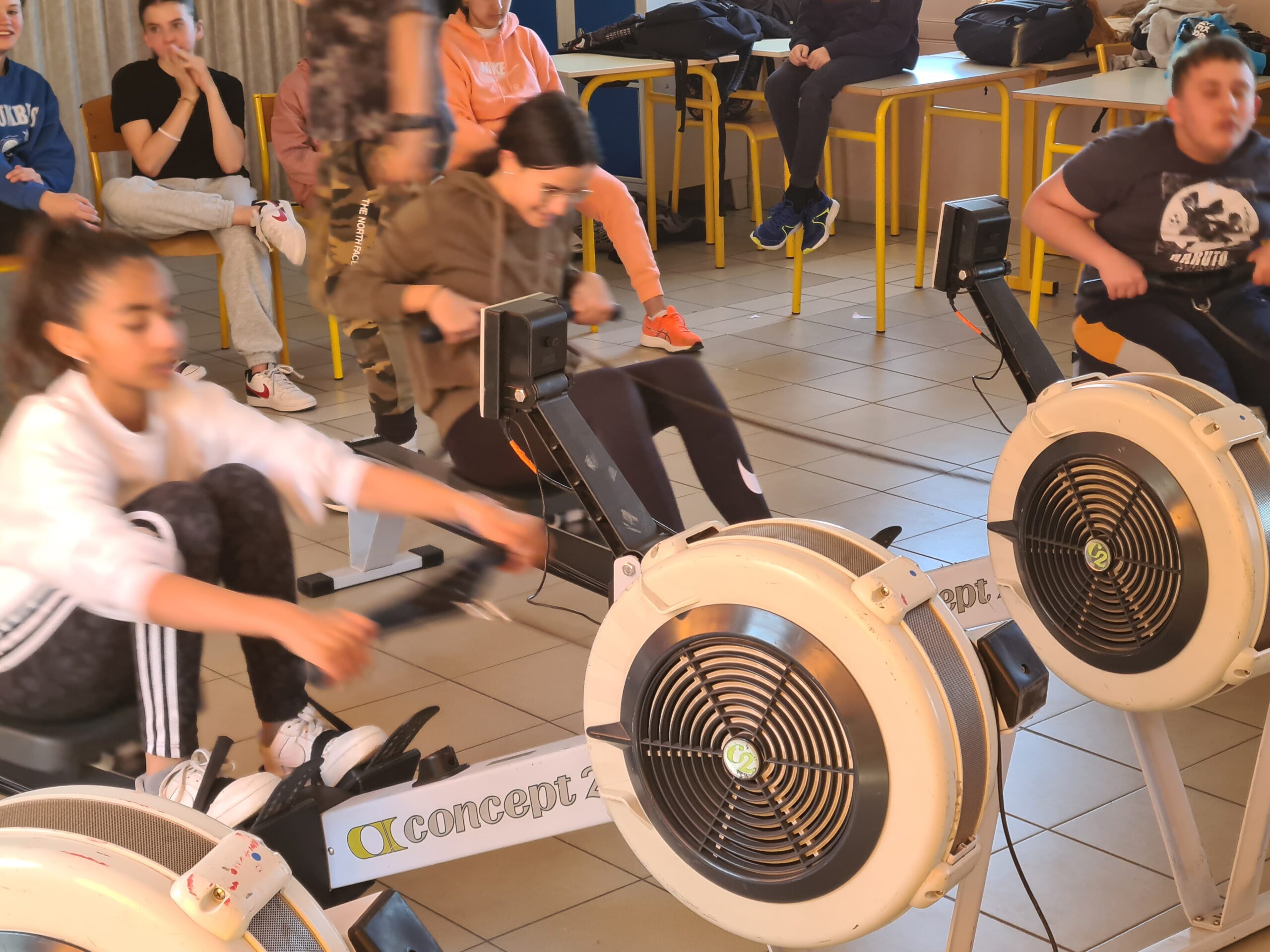 Jeudi 2 mars, les 5èmes B ont pu essayer un sport peu connu : l'aviron. Mais pas sur l'eau ! En classe ! " L'aviron indoor" est sport à par entière dans lequel on retrouve maintenant un véritable engouement avec des entrainements spécifiques et des compétitions. Pas d'équilibre à gérer, comme c'est le cas sur l'eau. Ni de coordination à trouver avec son ou ses partenaires. Seulement un effort d'endurance-force. C'est à dire qu'il s'agit d'efforts intenses mais que l'on tient plusieurs minutes. Cela se pratique sur machine (des rameurs!). Elles sont reliées à un ordinateur et un logiciel qui permet de voir la distance parcourue, la vitesse, la fréquence de rame, la cadence et sa place par rapport aux autres rameurs... Ils ont d'abord tenté de battre leur propre record sur 1min. (moyenne : 200m par élève). Nous avons additionné tous les résultats des élèves afin de se comparer aux autres classes de 5èmes de France... (résultats à venir sur le site "rameen5ème") Puis nous avons fait des relais de 4 personnes sur 1000m avec changement de rameur tous les 250m. Les élèves ont apprécié et certains ont trouvé l'effort particulièrement intense !!!!! Bravo à eux pour leur performance et leur bel état d'esprit !