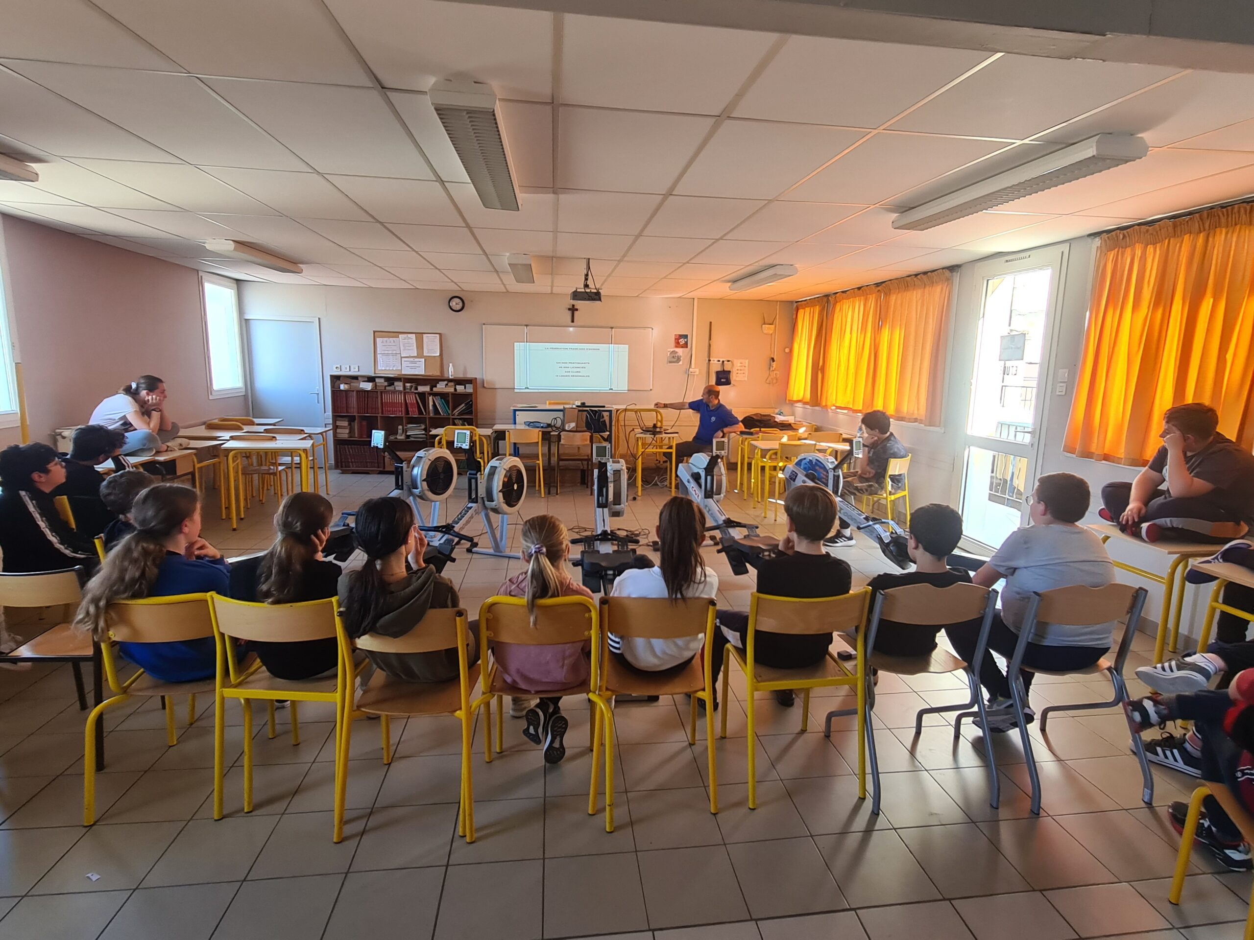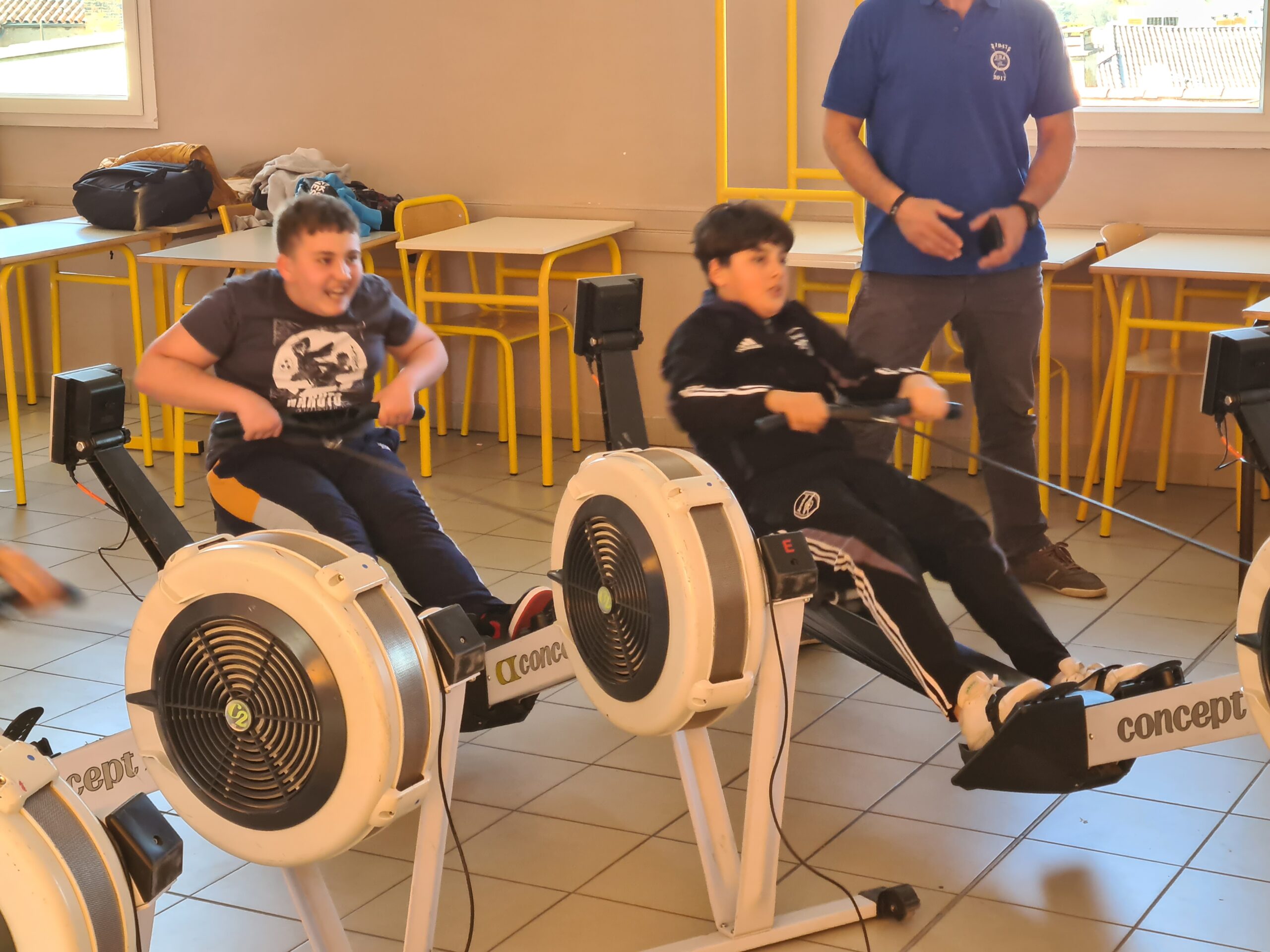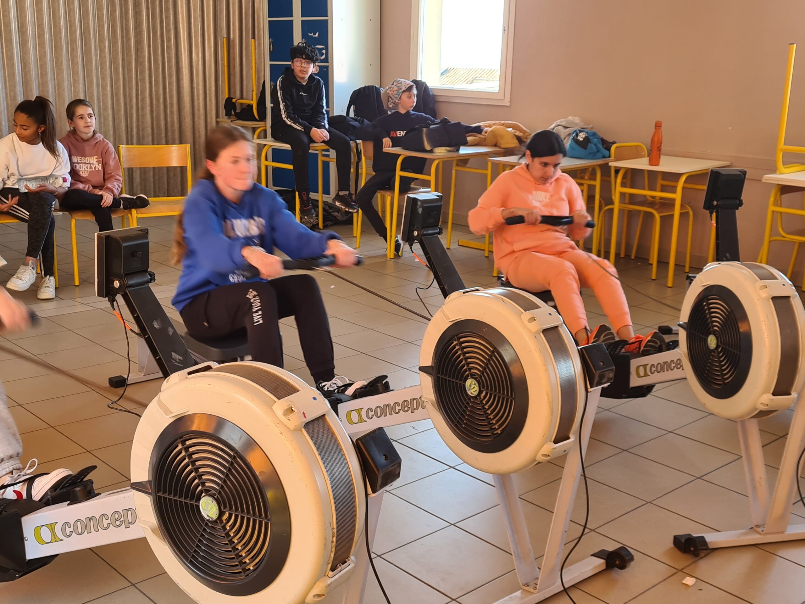 Jeudi 2 mars, les 5èmes B ont pu essayer un sport peu connu : l'aviron. Mais pas sur l'eau ! En classe ! " L'aviron indoor" est sport à par entière dans lequel on retrouve maintenant un véritable engouement avec des entrainements spécifiques et des compétitions. Pas d'équilibre à gérer, comme c'est le cas sur l'eau. Ni de coordination à trouver avec son ou ses partenaires. Seulement un effort d'endurance-force. C'est à dire qu'il s'agit d'efforts intenses mais que l'on tient plusieurs minutes. Cela se pratique sur machine (des rameurs!). Elles sont reliées à un ordinateur et un logiciel qui permet de voir la distance parcourue, la vitesse, la fréquence de rame, la cadence et sa place par rapport aux autres rameurs... Ils ont d'abord tenté de battre leur propre record sur 1min. (moyenne : 200m par élève). Nous avons additionné tous les résultats des élèves afin de se comparer aux autres classes de 5èmes de France... (résultats à venir sur le site "rameen5ème") Puis nous avons fait des relais de 4 personnes sur 1000m avec changement de rameur tous les 250m. Les élèves ont apprécié et certains ont trouvé l'effort particulièrement intense !!!!! Bravo à eux pour leur performance et leur bel état d'esprit !