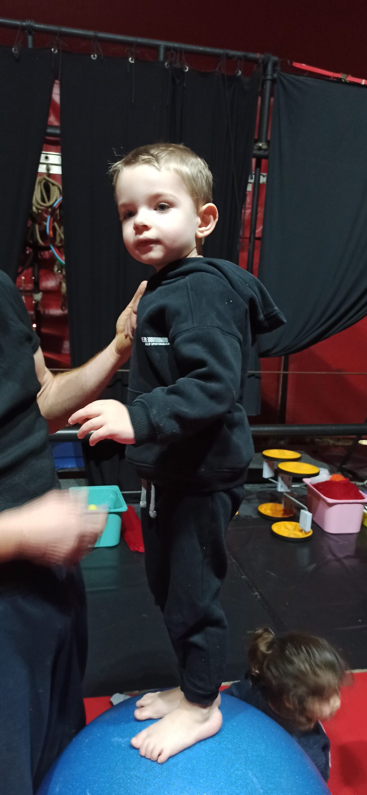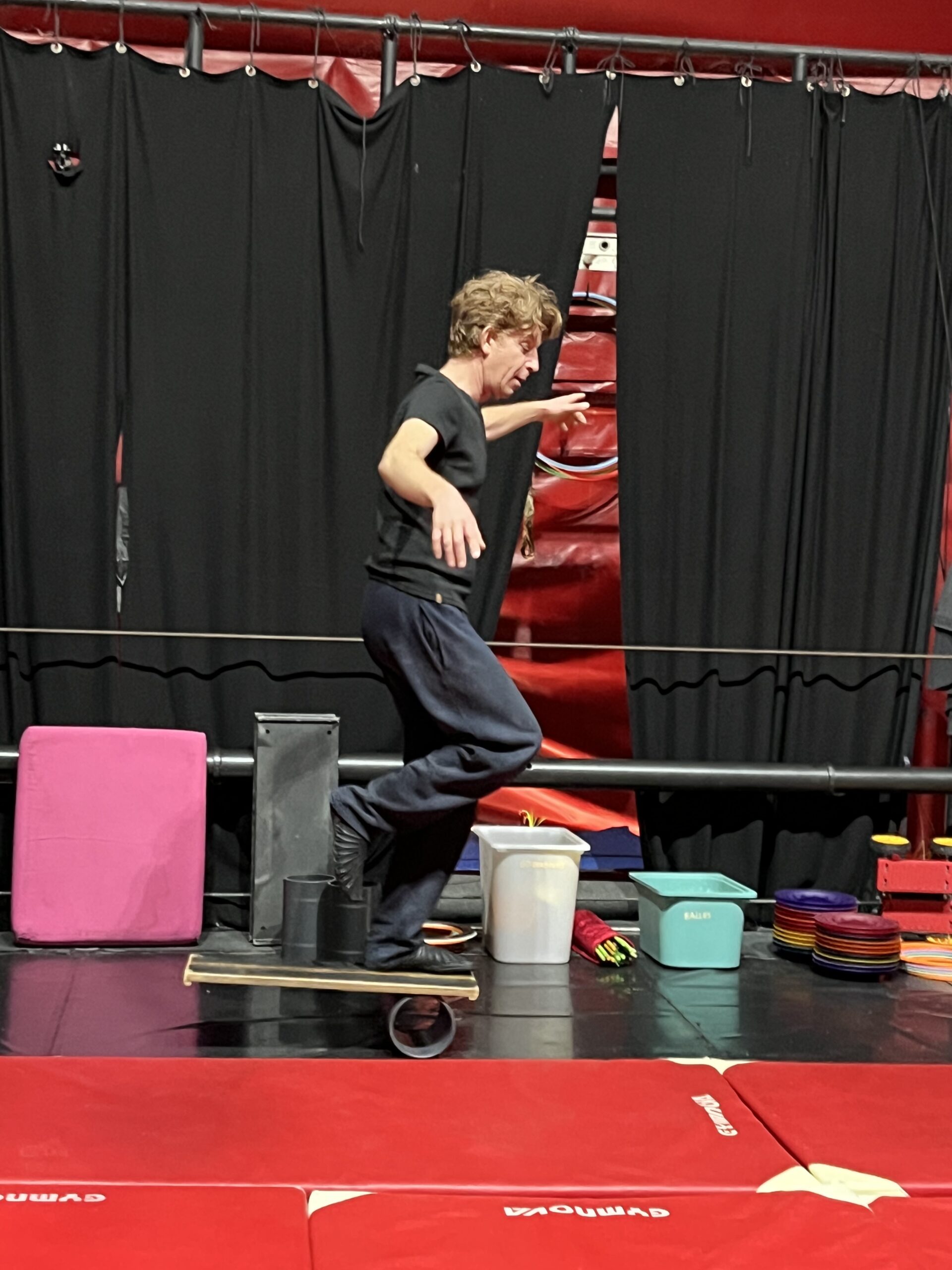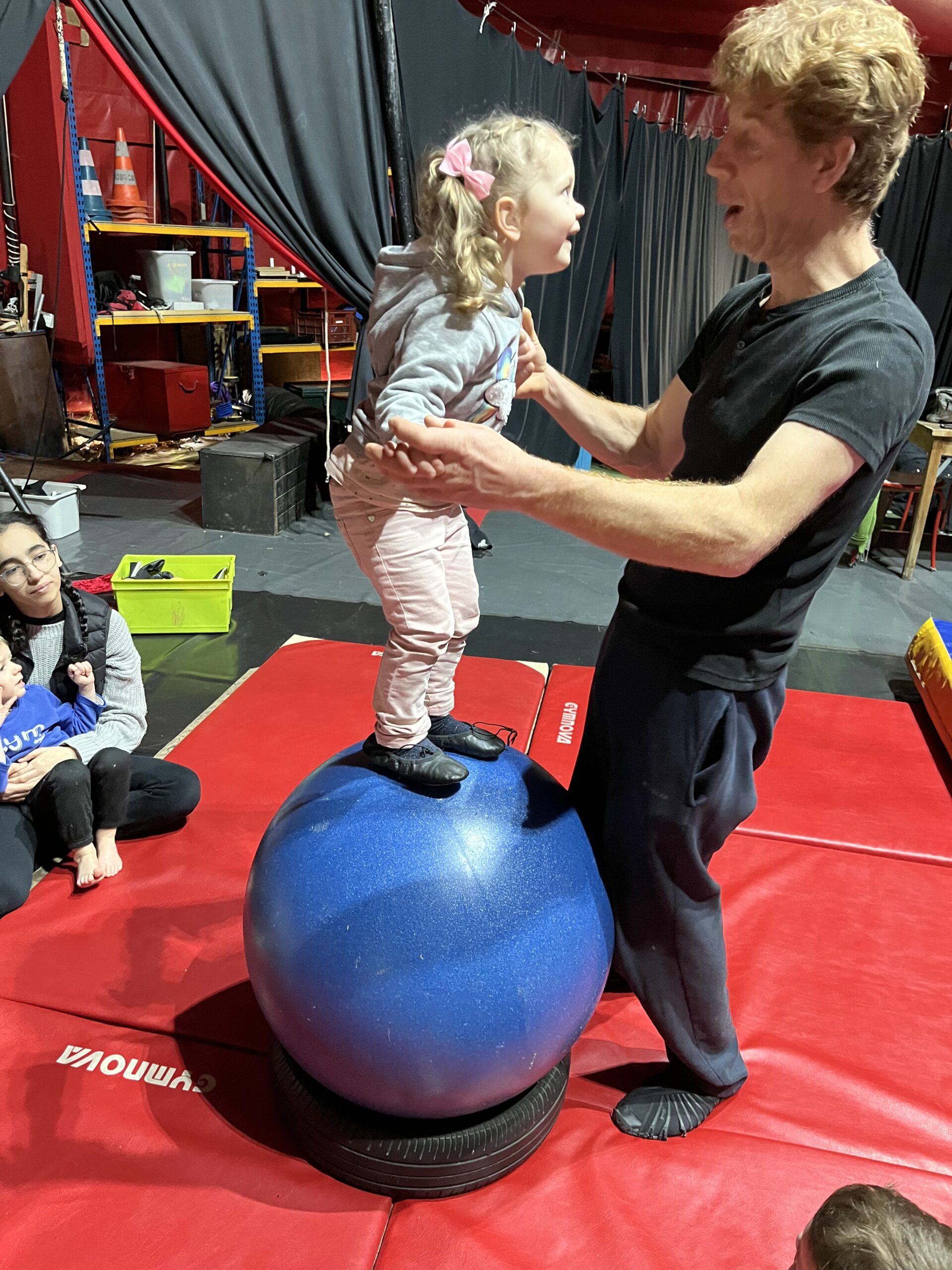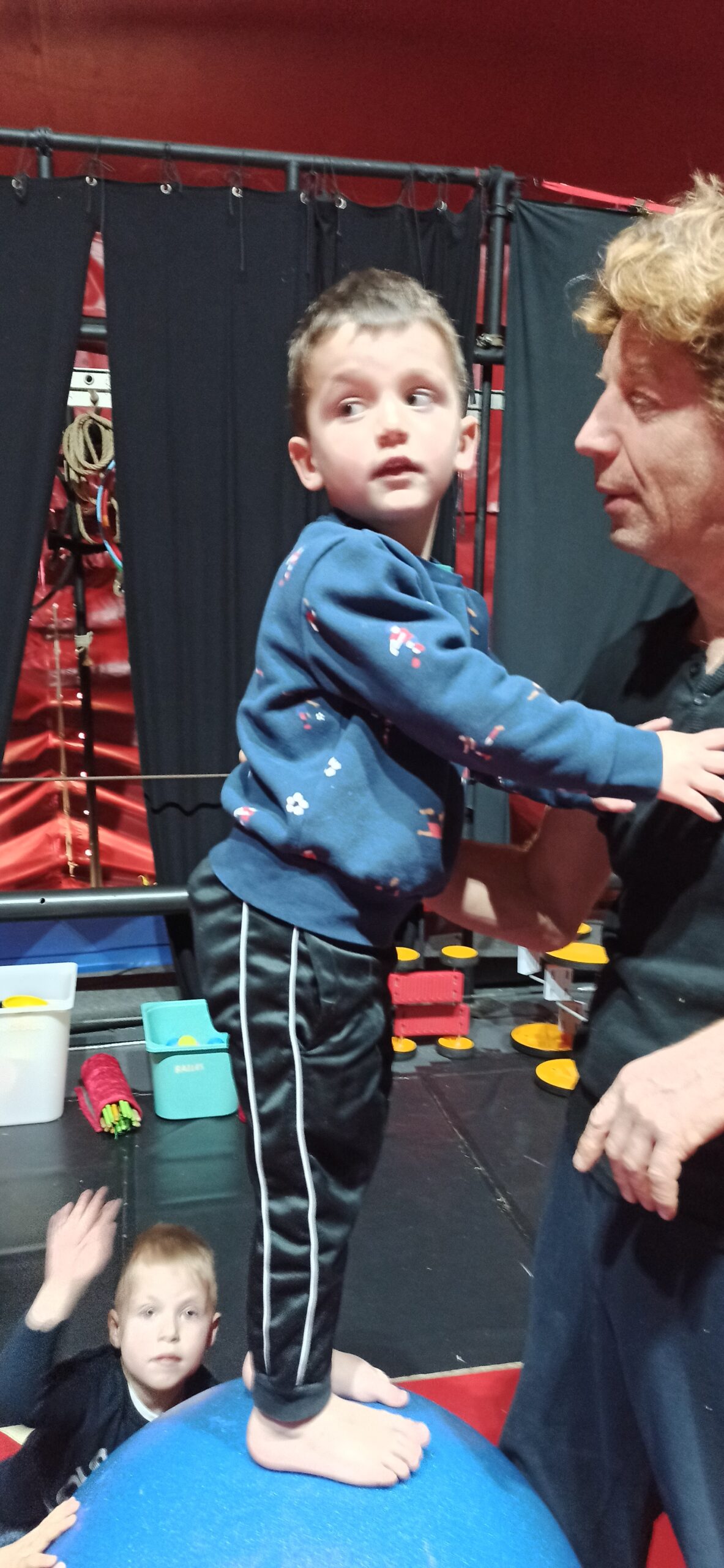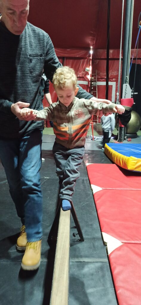 Nous avons fait une initiation aux équilibres, avons appris à nous tenir debout en équilibre sur les mains, nous avons appris à nous déplacer sur une poutre et à nous déplacer sur un drôle d'engin "un pédalo". La trapéziste nous a aussi montré comment faire pour monter sur le trapèze et faire quelques figures.