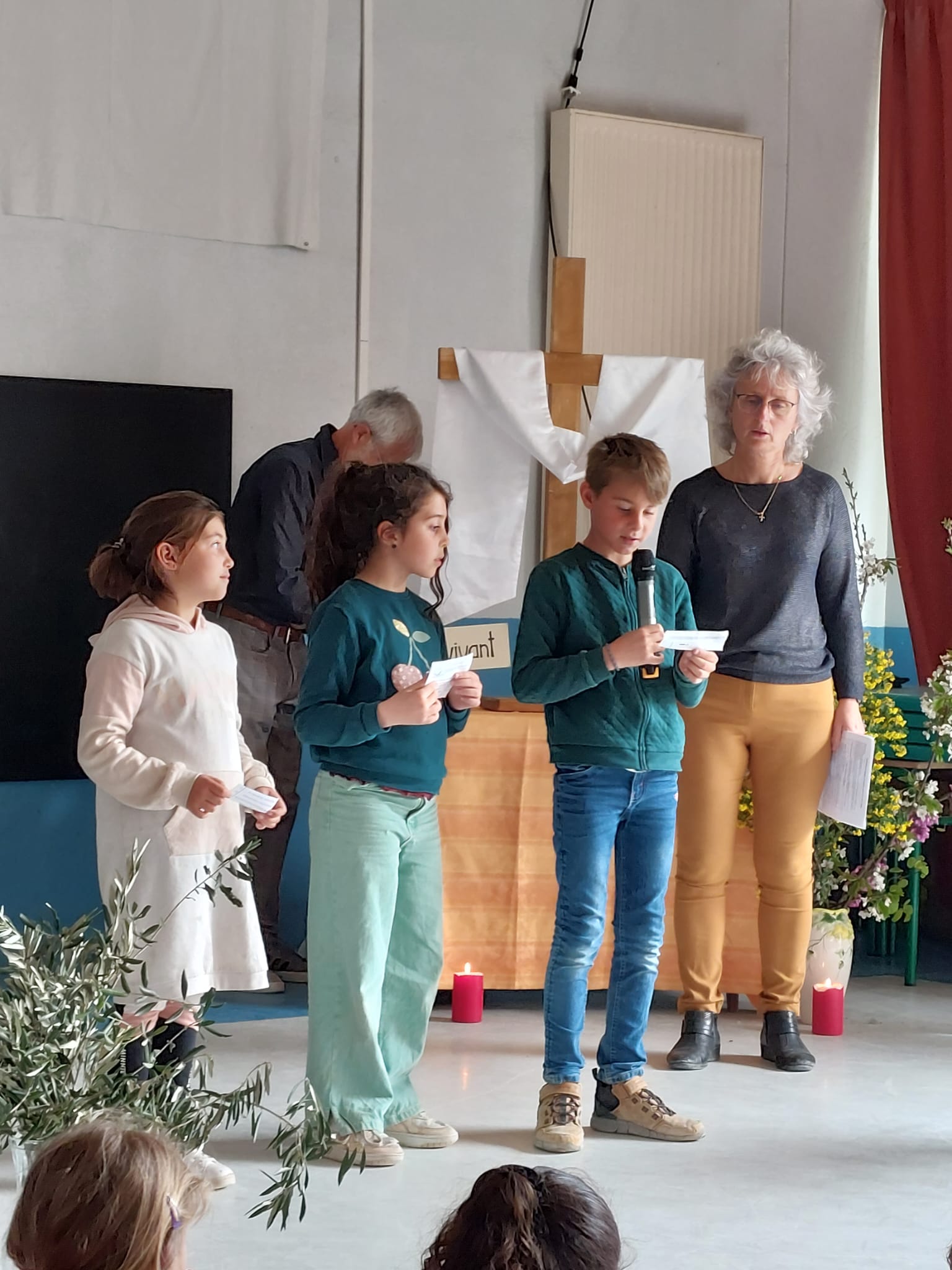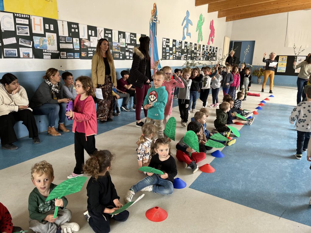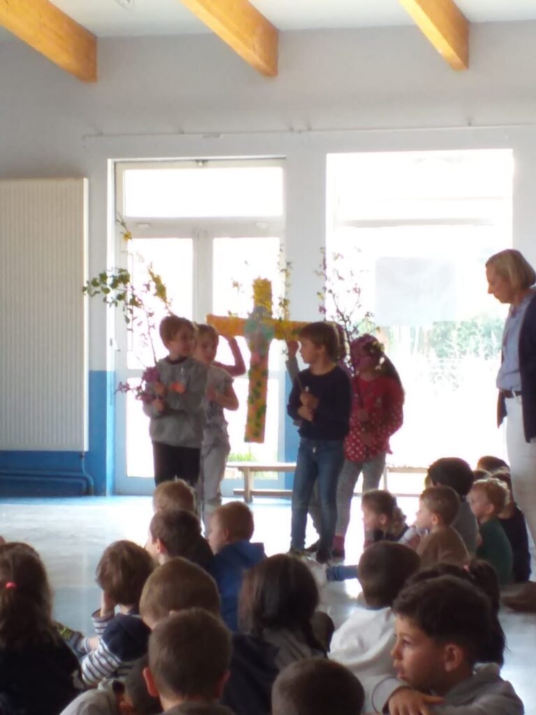 Enfin, mardi 11 avril, nous avons célébré Pâques, la joie du Christ Vivant ! Toutes les classes avaient appris des beaux chants, fleuri une croix. Alléluia !