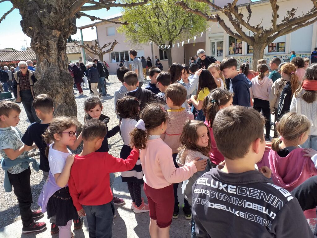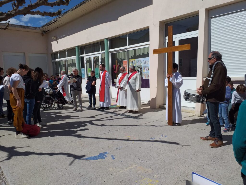 L'après-midi, les CM1 avaient préparé une étape du Chemin de Croix dans la cour de l'école. Le Père Vallon et les nombreux paroissiens se sont joints à nous. Nous avons été très émus et en geste de tendresse chacun était relié à un autre en se touchant l'épaule.