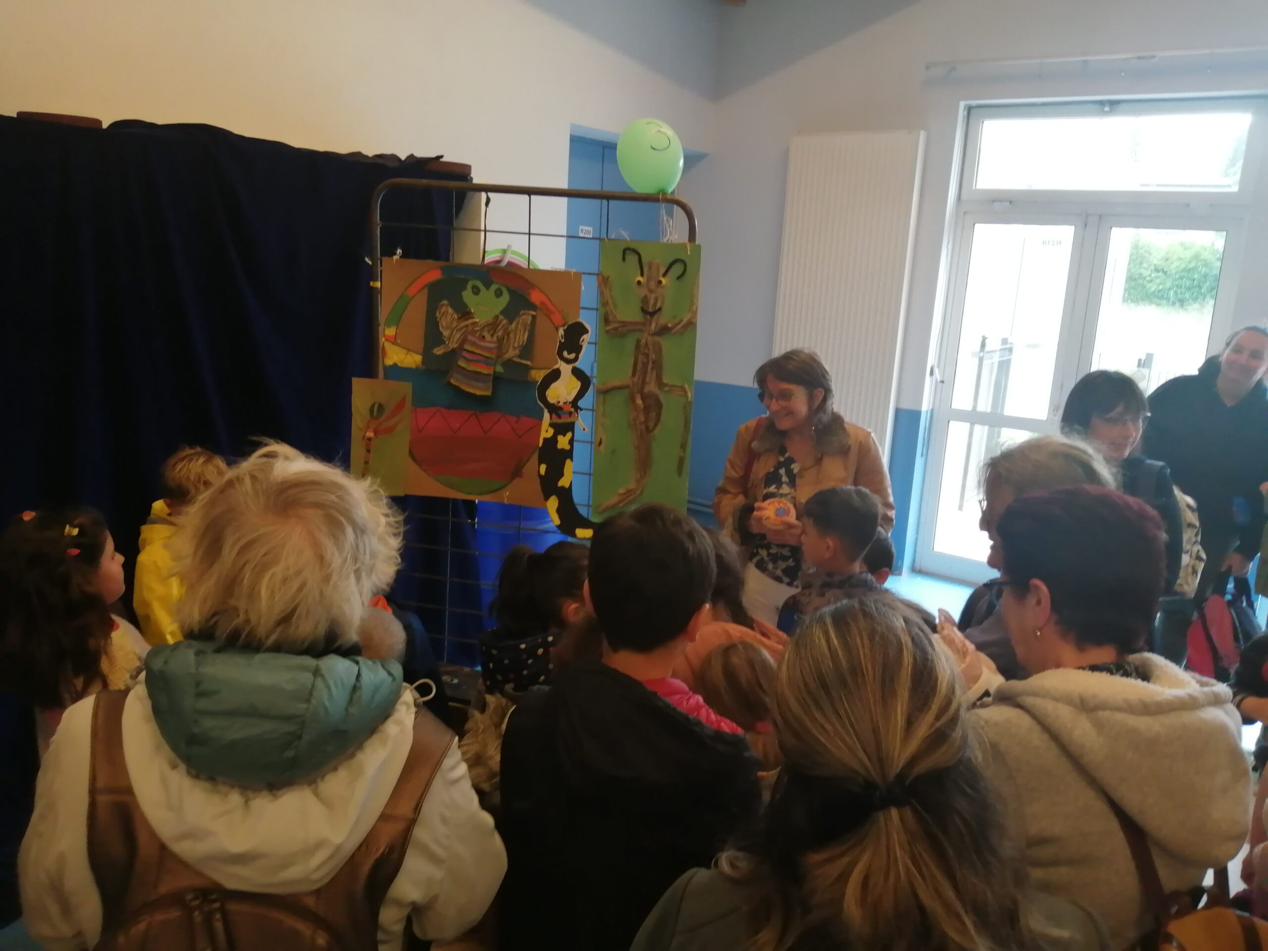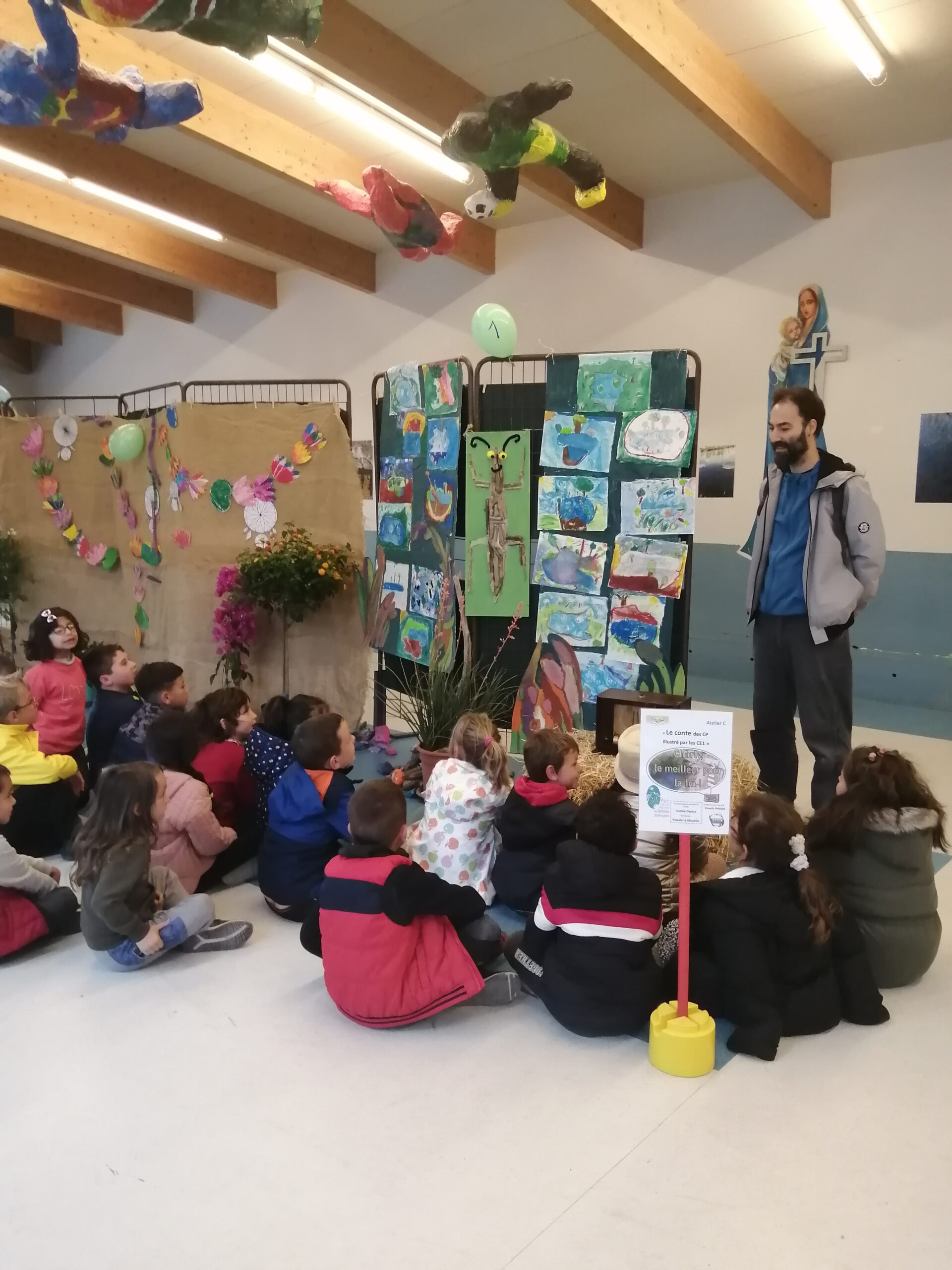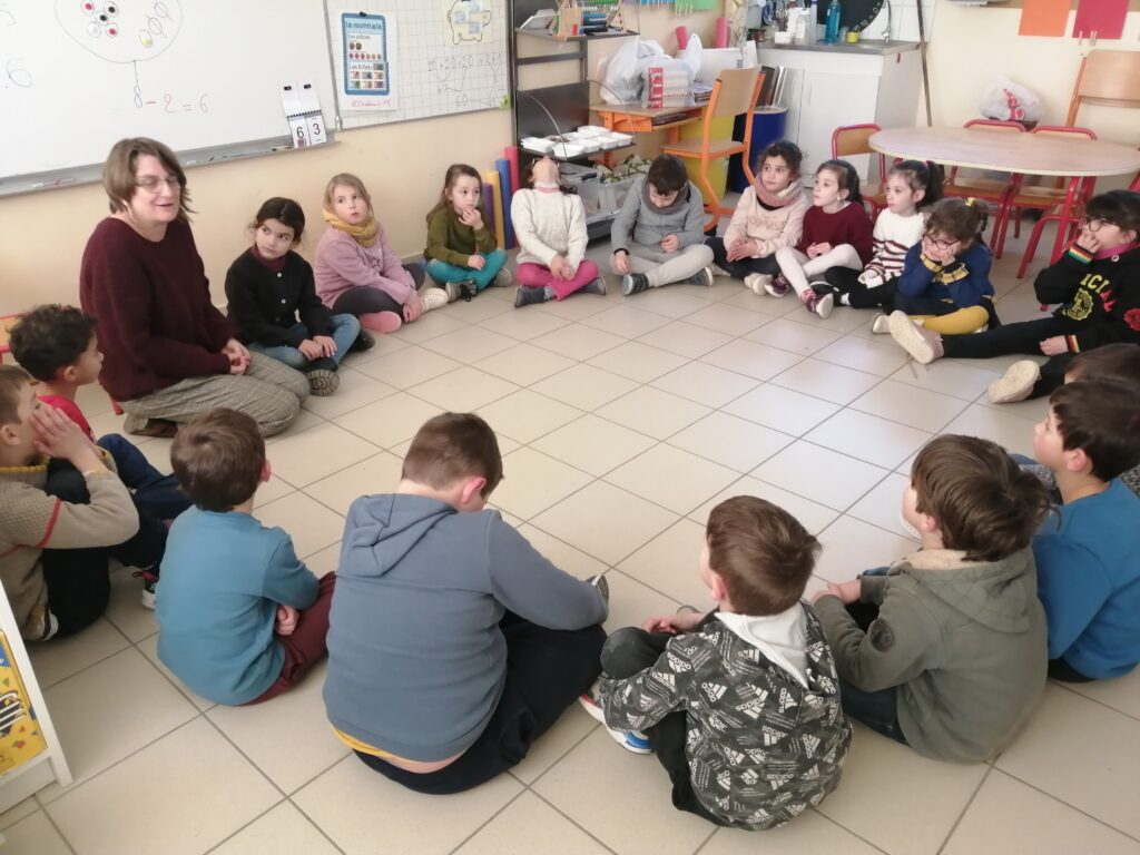 Installés en cercle, accompagnés par Sophie Deplus, les élèves de CP ont imaginé un scénario, créé des personnages et ils sont devenus conteurs !