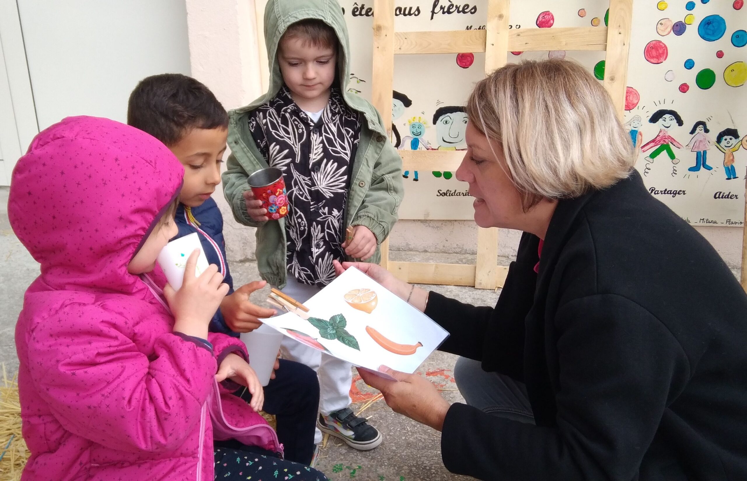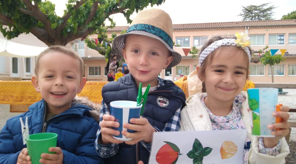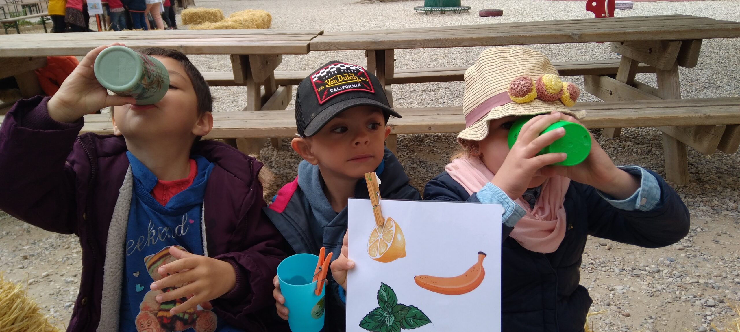 Dans un premier temps, Laure et Laëticia (deux mamans membres de l'APEL) ainsi que Laëtitia et Claude nous ont proposé de goûter trois eaux différentes : nous devions deviner avec quoi chacune de ces eaux avaient été aromatisée. Et nous avons trouvé ! La première était aromatisée à l'orange, la deuxième à la menthe et la troisième à la fraise...