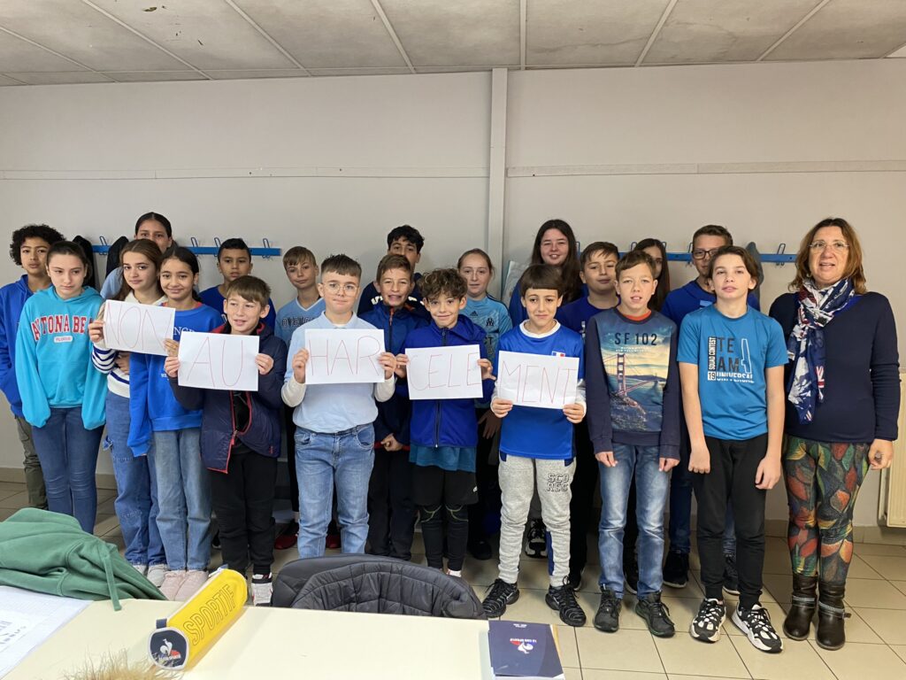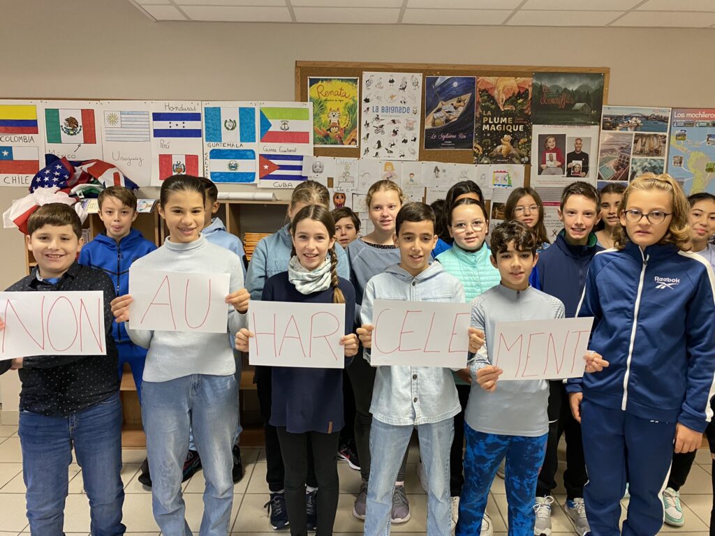 Tous les élèves n'ayant pas pu former à la récréation du matin un « N A H » (Non Au Harcèlement) à cause de la pluie battante, chaque classe a ,selon ses possibilités, participé et les photos ci-dessous en sont la preuve.