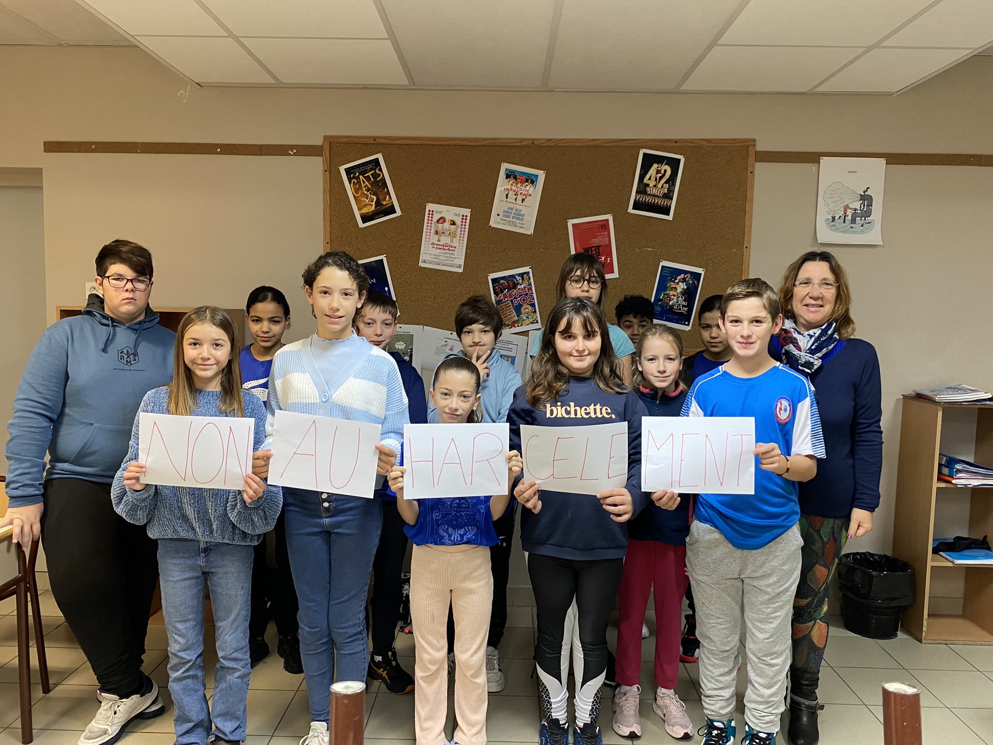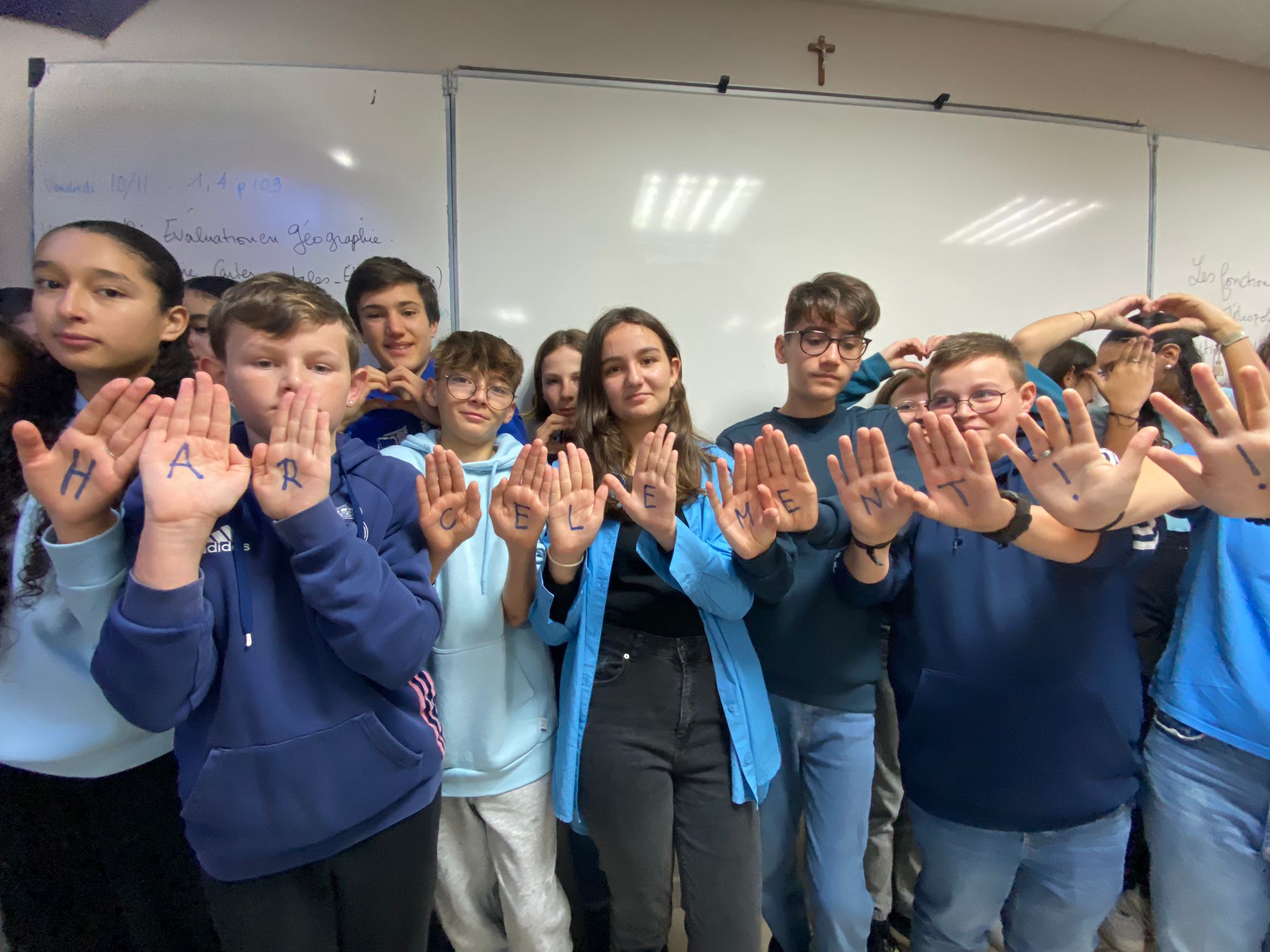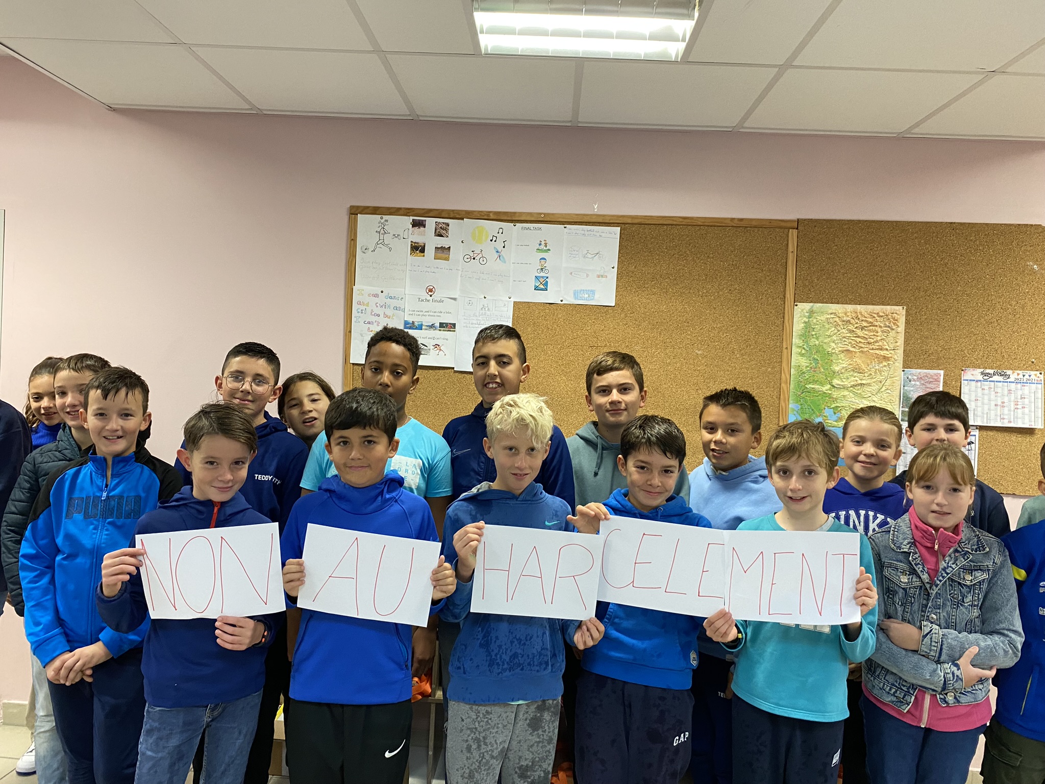 Tous les élèves n'ayant pas pu former à la récréation du matin un « N A H » (Non Au Harcèlement) à cause de la pluie battante, chaque classe a ,selon ses possibilités, participé et les photos ci-dessous en sont la preuve.