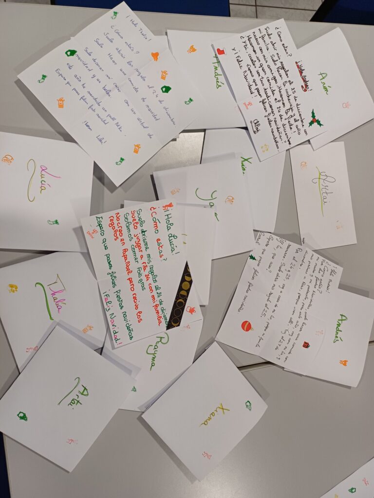 Les élèves de 4e et de 3e issus de la classe bilangue ont la chance cette année de pouvoir participer à un échange épistolaire avec un collège de MACEDA en Galice. Après un premier envoi et une première réception de lettres, ce sont les cartes de vœux qui partent vers leurs correspondants espagnols. ¡Felices fiestas navideñas!