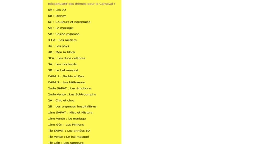 - La classe la mieux déguisée : Des membres du jury ont été présents tout au long de la journée pour visualiser les classes, les critères pour ce concours sont le respect du thème choisi par le plus d’élèves possibles de la classe, l’originalité du thème et la qualité des déguisements et accessoires.