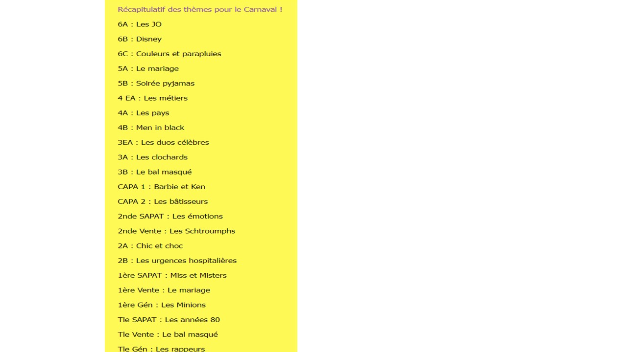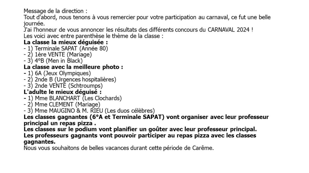 Cette année, trois concours ont été mis en place autour du CARNAVAL pour le 2nd degré avec à la clef un repas-pizza avec sa classe :