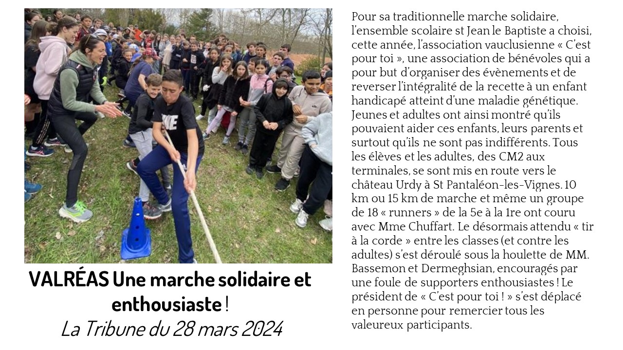 Notre traditionnelle Marche solidaire s'est déroulée ce lundi 25 mars 2024 (un jour avant la date initialement prévue pour cause de pluie annoncée) et nous avons choisi de parrainer l’association vauclusienne « C’est pour toi ». « C’est pour toi » est une association de bénévoles qui a pour but d’organiser des évènements et de reverser l’intégralité de la recette à un enfant handicapé atteint d’une maladie génétique. Cette association est là pour montrer que nous pouvons aider ces enfants, leurs parents et surtout qu’ils ne nous sont pas indifférents.